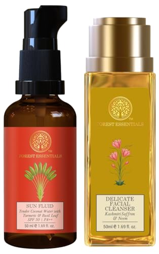 Forest Essentials SUN FLUID Tender Coconut Water with Turmeric & Basil Leaf SPF 50 | PA + +| 50 ml & Travel Size Delicate Facial Cleanser Kashmiri Saffron & Neem| 50 ml Combo