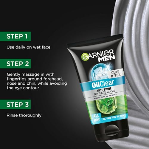 Deep clean your skin unclog your pores and enjoy an all day oil-free feel with the Garnier Men Oil Clear Clay D-Tox Deep Cleansing Icy Face Wash. The Garnier Men Oil Clear Face Wash purifies your skin gently targets all skin impurities and removes excess oil without drying out your skin. The mineral clay in the face wash for oily skin controls excess sebum production while keeping the skin’s natural oils and moisture levels intact. This intense anti-grease action ensures that your skin remains non-oily without feeling dry and uncomfortable all day. The menthol in the face wash instantly refreshes your complexion and gives you a cooling sensation that makes you feel fresh all day. Use the Garnier face wash for men to freshen up your complexion get rid of dirt oil and sweat and reveal bright and clean skin.