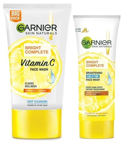 Garnier Skin Naturals Bright Complete Vitamin C Face Wash - Vitamin C Face Wash For Brighter and Glowing Skin - Suitable For all Skin Types 150gFlaunt clear radiant and glowing skin with the Garnier Bright Complete Vitamin C face wash. Infused with the brightening properties of Yuzu lemon. Garnier skin naturals face wash thoroughly cleanses the skin and gives it an instant boost of freshness and radiance. Include the Bright Complete Vitamin C face wash in your skincare routine along with other Garnier Bright Complete products and get visible results in no time. Step 1: Apply the Bright Complete Garnier face wash for women on wet face and massage gently avoiding the eye contour area. Step 2: Wash your face and pat your skin dry. Step 3: Next apply the Garnier Vitamin C serum followed with Vitamin C day cream and Vitamin C night cream during AM and PM respectively.Garnier Skin Naturals Facewash Oil Clearing Bright Complete Brightening Duo Action 100 gPollution dirt harsh environmental aggressors a hectic lifestyle... All of this can make your skin look dull & tired as well as give rise to uneven skin pigmentation and dark spots. Restore your skin's natural glow by cleansing your face with a facewash like Garnier's Bright Complete Brightening Duo Action Face Wash. This face wash is especially suitable for oily skin because it is enriched with White Clay which helps clear excess oil in the skin and lemon extracts & vitamins including Vitamin B4 and Vitamin Cg that lessen current dark spots and prevent new ones from forming as well as reduces overall dullness in the skin.