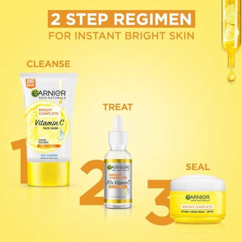 Get your hands on the Vitamin C Regime Pack and get bright skin with every step in your skincare routine. This thoughtfully curated regime pack is packed with Garnier Skin Natural's best selling products which our packed with the goodness of Vitanin C. Start your journey to bright skin with Garnier's Bright Complete Facewash Bright Complete Serum enriched with 30X* Vitamin C and Bright Complete SPF 40 which not only brightens but also protects your skin from harmful UV Rays. Get your hands on the best of nature and science to get bright glowing skin!