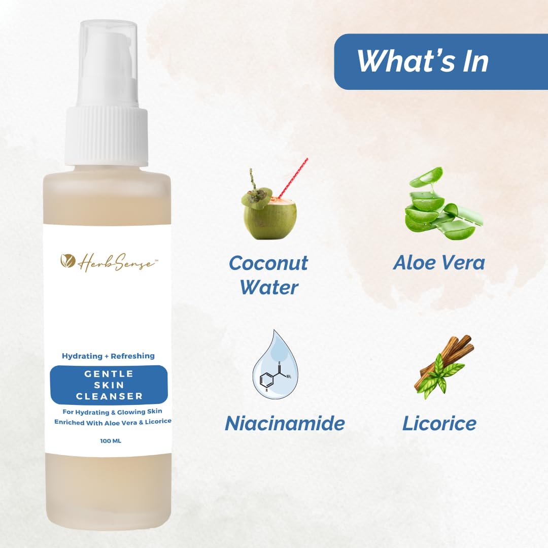 Herbsense Hydrating Gentle Skin Cleanser is a mild -free cleanser that works gently on skin without stripg away natural oils and nutrients.It is a water-based and non-comedogenic (does not block pores) formulation. Ideal for dry and flaky skin the powerful blend of Aloe Vera Licorice and Coconut Water it deeply hydrates the skin while making it soft glowing and smooth. While Niacinamide Vitamin B5 Hyaluronic Acid and Hydrating Glycerin Helps to reinforce skin’s natural moisture barrier even after repeat washes.