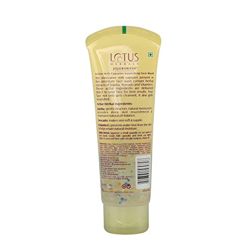Refresh Your Skin With Every Wash . Power packed with active milli capsules which enrich and protect your skin the Jojobawash Active Milli Capsules Nourishing Face Wash from Lotus Herbals instantly revives and refreshes your skin. The Milli Capsules formulated using jojoba oil avocado and vitamin e extracts moisturize your skin making it soft supple and naturally radiant! . Active Milli Capsules . The revolutionary active milli capsules from the house of Lotus Herbals are created using extracts of: Jojoba Oil . Jojoba oil is a natural moisturizer which penetrates deep into the pores of your skin and moisturizes it from within. It also helps maintain the pH balance of your skin making it healthier and naturally radiant Avocado. Avocados are rich in carotenoids which improve skin elasticity and reduce visible signs of aging. The rich antioxidant properties of avocado fight free radicals and protect your skin from external damage Vitamin E . Vitamin E is a fat soluble antioxidant which protects your skin from harmful damage by UV rays. It also prevents premature aging of skin by fighting oxidizing free radicals.