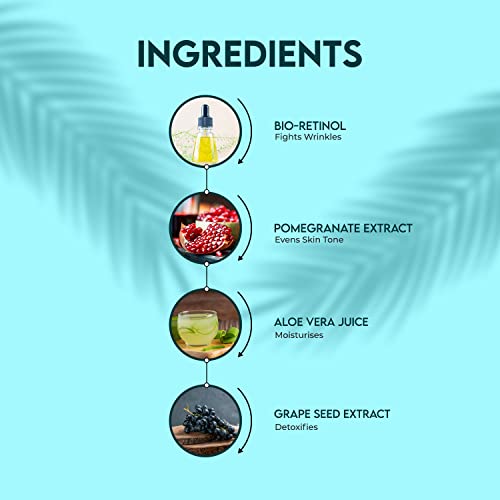• Ingredients: Bio-retinol (Biden pilosa extract Elaeis guinensis oil Gossypium herbaceum seed oil Linum usitatissimum oil) Pomegranate extract Aloe vera juice Grape seed extract Olivem-400 Carbomer Decyl glucoside Lauryl glucoside Coco amido propyl betain