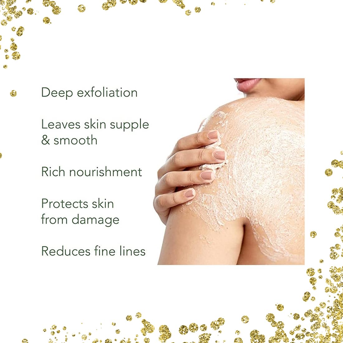 [SCRUB] Experience the luxury of the Gold Scrub designed to exfoliate and invigorate your skin. Infused with gold dust and natural exfoliating agents this scrub gently eliminates dead skin cells promoting cell turnover and revealing a brighter smoother co