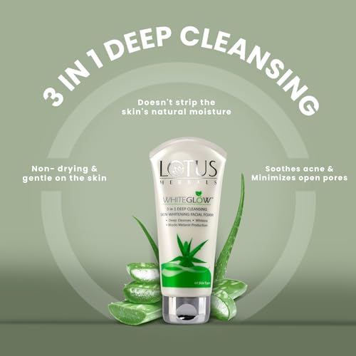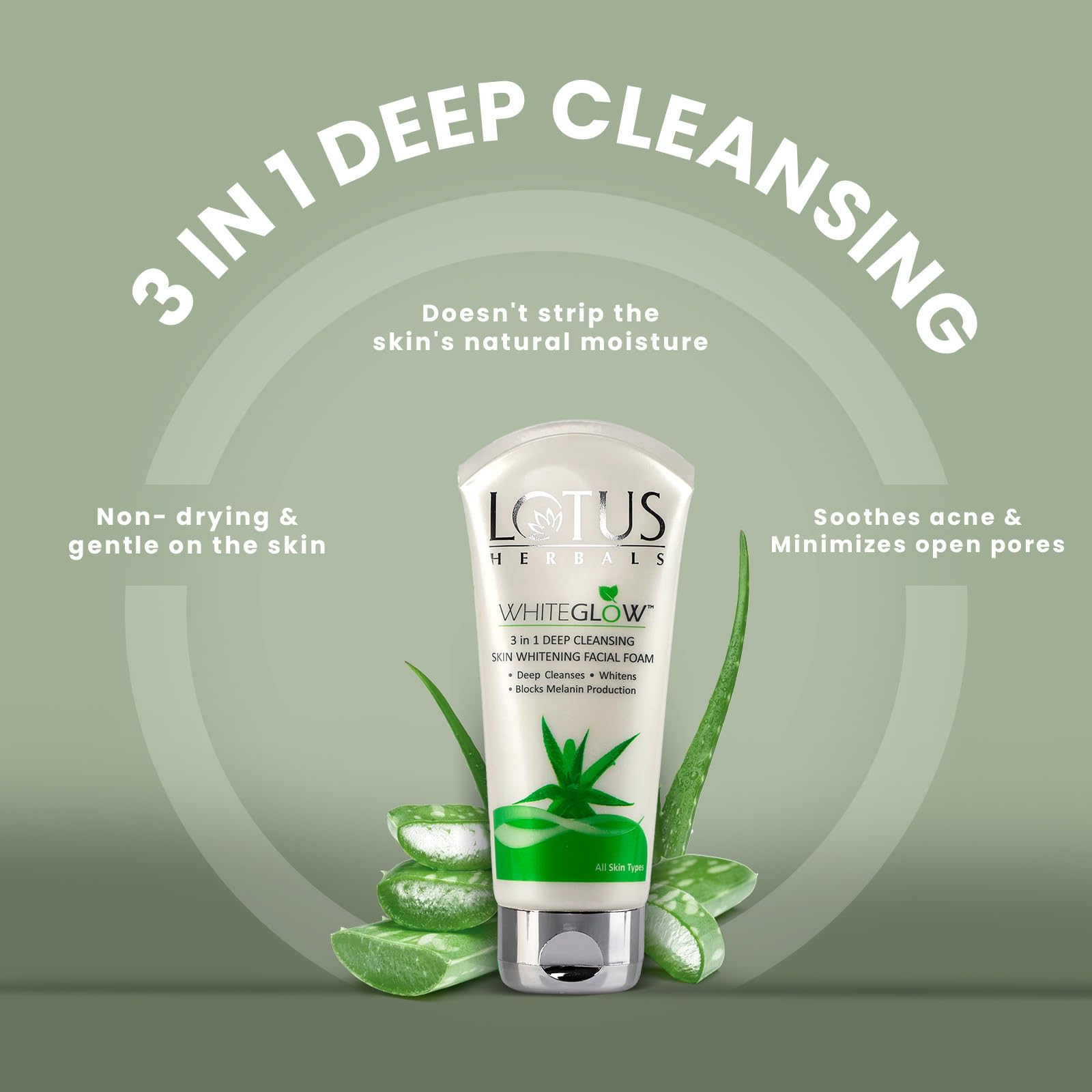 Lotus Herbals Whiteglow 3 In 1 Deep Cleaning Skin Whitening Facial Foam | Chemical Free | With Milk Enzymes & Aloe Vera Gel | For All Skin Types | 50g