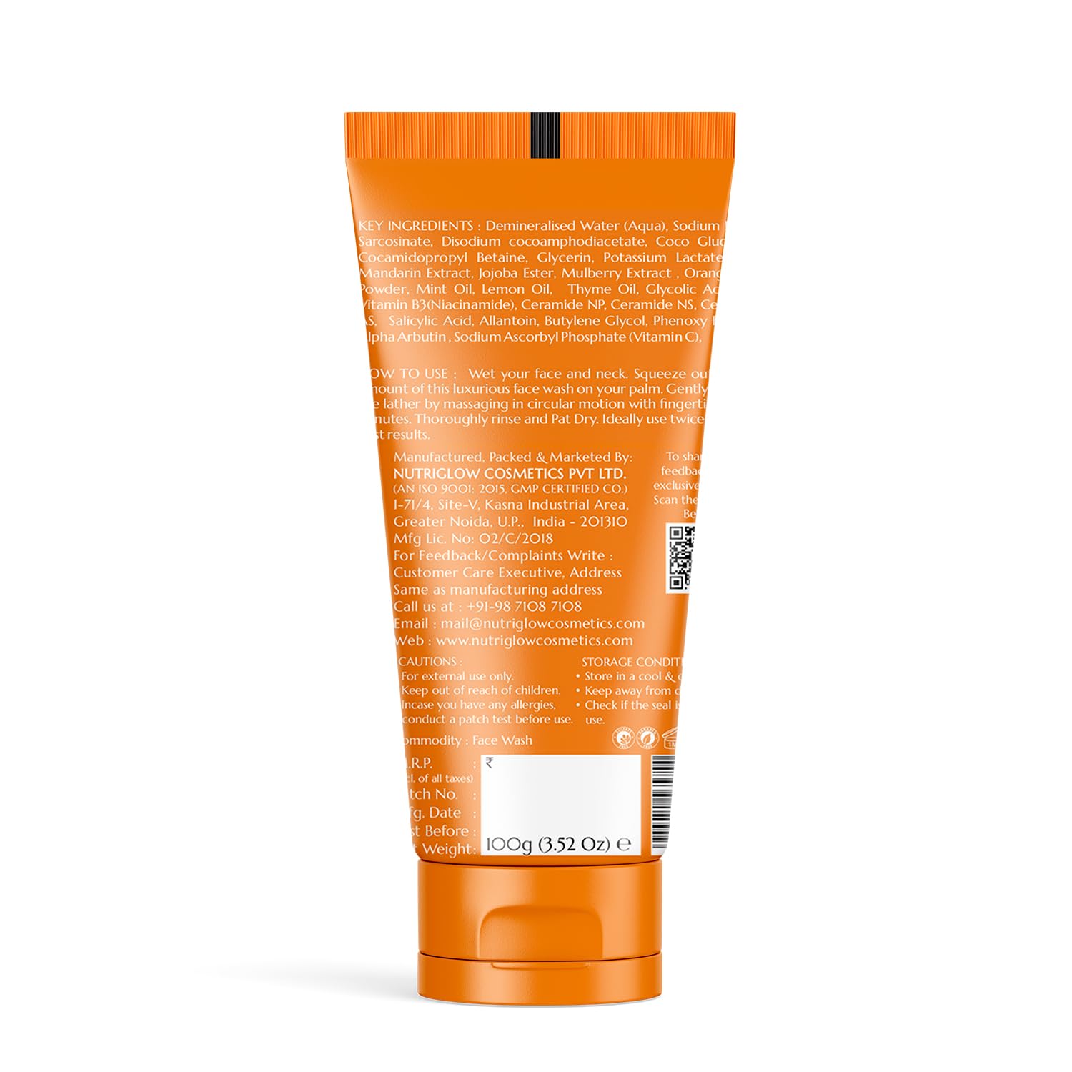 Want to get a glowy brightening shiny radiance on your face? Try out this NutriGlow Advanced Organics Vitamin C Lightening Facewash curated with all the required extracts of natural components that can help you remove the impurities dead skin and pigmentation off the face. This face wash is enriched with a high-quality concentration of alpha arbutin glycolic acid skin ceramides mandarin and vitamin C to give you a perfect natural glow. Vitamin C itself has many benefits ing up properties for skin collagens to make your look younger properties to keep you away from the acne-causing agents and the power to fight impurities etc. The skin ceramides take care of your skin to fight hydration acne and blemishes. The combination of glycolic acid and mandarin is responsible for improving skin quality by eliminating wrinkles reducing scars and fine lines and o the damage caused by the sun. The alpha-arbutin is the ultimate source of giving a natural glow to your face by removing the dead skin and a layer from your face. The NutriGlow Advanced Organics Vitamin C Lightening Face wash has been dermatologically tested for all skin types people including men and women; it is cruelty-free and does not include any form of sulfates or parabens; it is not promoting any kind of harsh chemical. To use this face wash you need to wash your face with lukewarm water and then take a coin-sized amount on your palms. Spread the facewash all over your face and neck then gently massage using your fingertips. Rub it until 2-3 minutes and wash it off to follow with a good face serum or moisturizer. Make sure to avoid this face wash's contact with eyes and mouth. Wash it off thoroughly in case of any such incident.