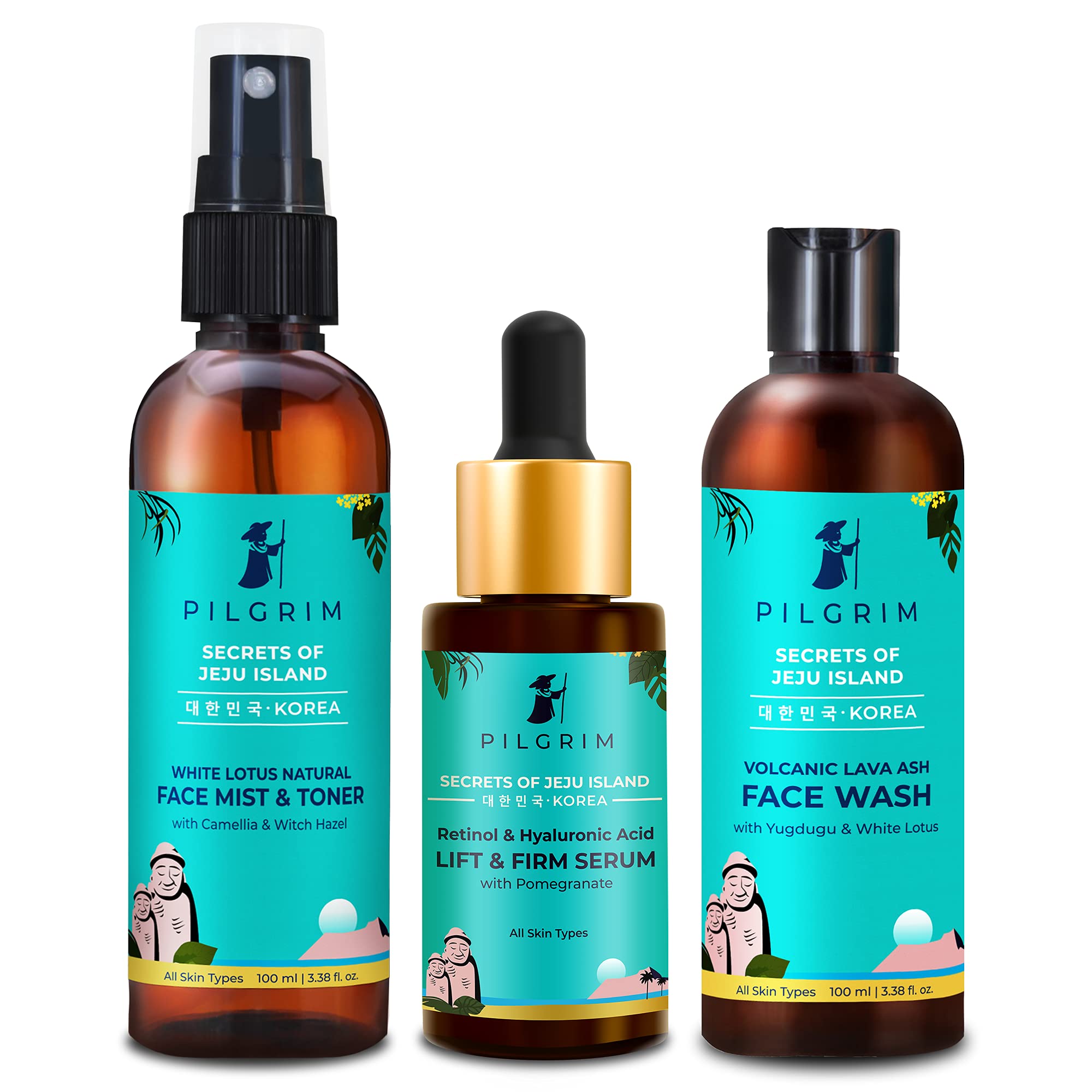 "Pilgrim Lift & Firm Contouring serum is the perfect formulation of Retinol Hyaluronic Acid & Pomegranate extracts. Pomegranate flower extract maintains the elasticity of the skin promotes the formation of new collagen fibres and preserves existing ones.Retinol prevents and fights signs of aging like wrinkles and fine lines and maintains the skin in optimal health. Hyaluronic Acid holds a hundred times its weight in moisture and infuses it into the deeper layers of the skin for an instant facelift and boost in vitality. This toner spreads evenly and is instantly absorbed revealing soft smooth and glowing skin. Use as many times in a day to refresh and hydrate the skin and overtime achieve a firmer brighter skin by this youth elixir in a bottle! Refresh your face with our gentle mild yet effective cleanser for deep pore cleansing oil control and pollution defence. Crafted with Volcanic lava ash Yugdugu and White lotus."