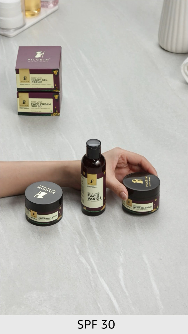 PILGRIM French Red Vine AM PM Care Kit, Wash 100ml, Cream SPF 30 50gm, Night Gel Creme 50gm, Anti-Ageing, De-Pigmentation, Skin Repair, All Types, Men & Women