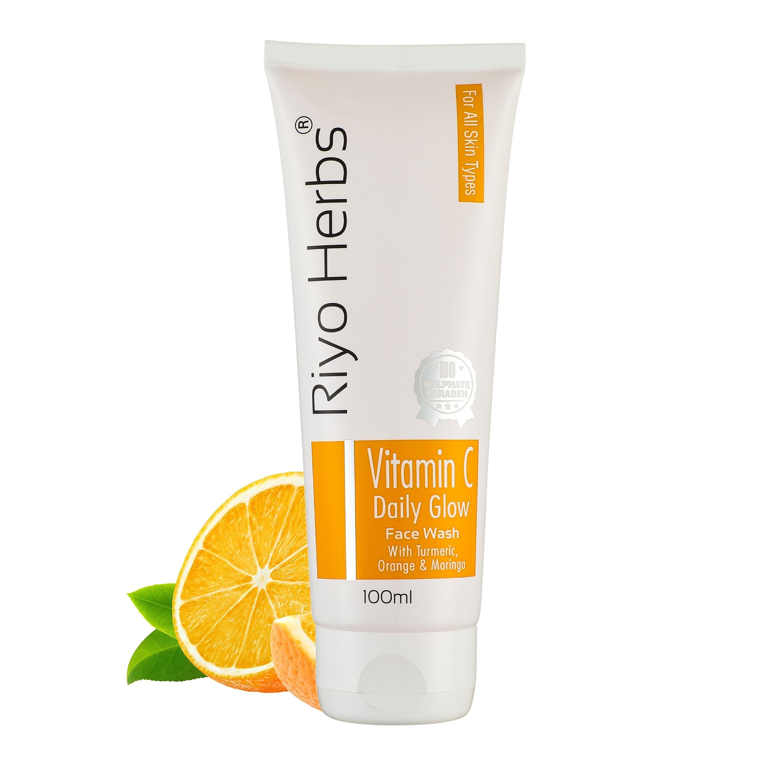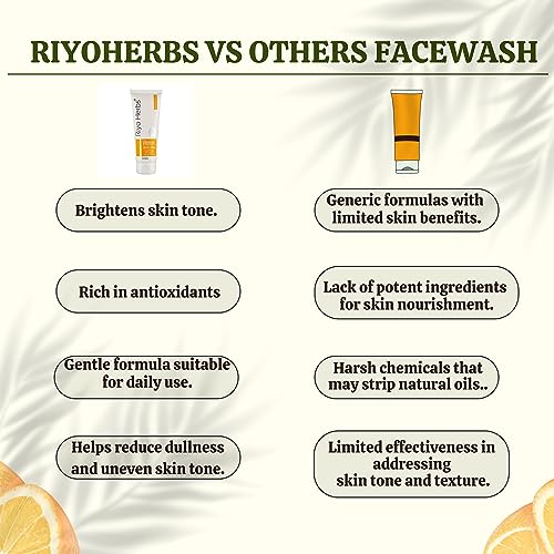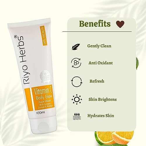 Riyoherbs Vitamin-C Daily Glow Facewash has rich source of Vitamin C along with TurmericMoringa and Orange peel extract which benefits in brightening and enlightenment of dull and tired skin. Helps heal skin damage caused due to UV Rays/ Sun exposure which lightens dark spots scars & prevents acne. Not recommended for very Dry skin.Why choose Riyoherbs Vitamin-C Daily Glow Facewash???Helps in brightening dull skin.Helps even tone skin & reduce dark spots.Removes excess oil & prevents acne.Boosts collagen production.Calms irritation and redness of the skin.Ingridients:-Purified Water. Decyl Glucoside Glycerin PEG-7 Glyceryl Cocoate Curcuma Longa (Turmeric) ExtractGlycyrrhiza Glabra (Licorice) Extract Citrus Aurantium Dulcis (Orange) Peel ExtractMoringa Oleifera (Sahjan) ExtractMelia Azadirachta Indica (Neem) ExtractAloe Barbadensis Leaf Extract Citrus Limon Peel OilTocopheryl (Vitamin E) Acetate Menthol.How to use:-Take a small amount of face wash gel and gently massage onto wet face.Rinse it off with enough water & feel refreshed.Net Vol-100ml