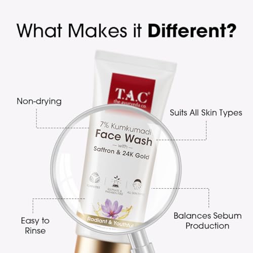 GENTLE SKIN CLEANSER: Deep cleanse dirt impurities and excess oil build-up accumulated on the skin surface with T.A.C Kumkumadi Face Wash. The mild face wash for glowing skin gently cleanses and refreshes your skin all day long