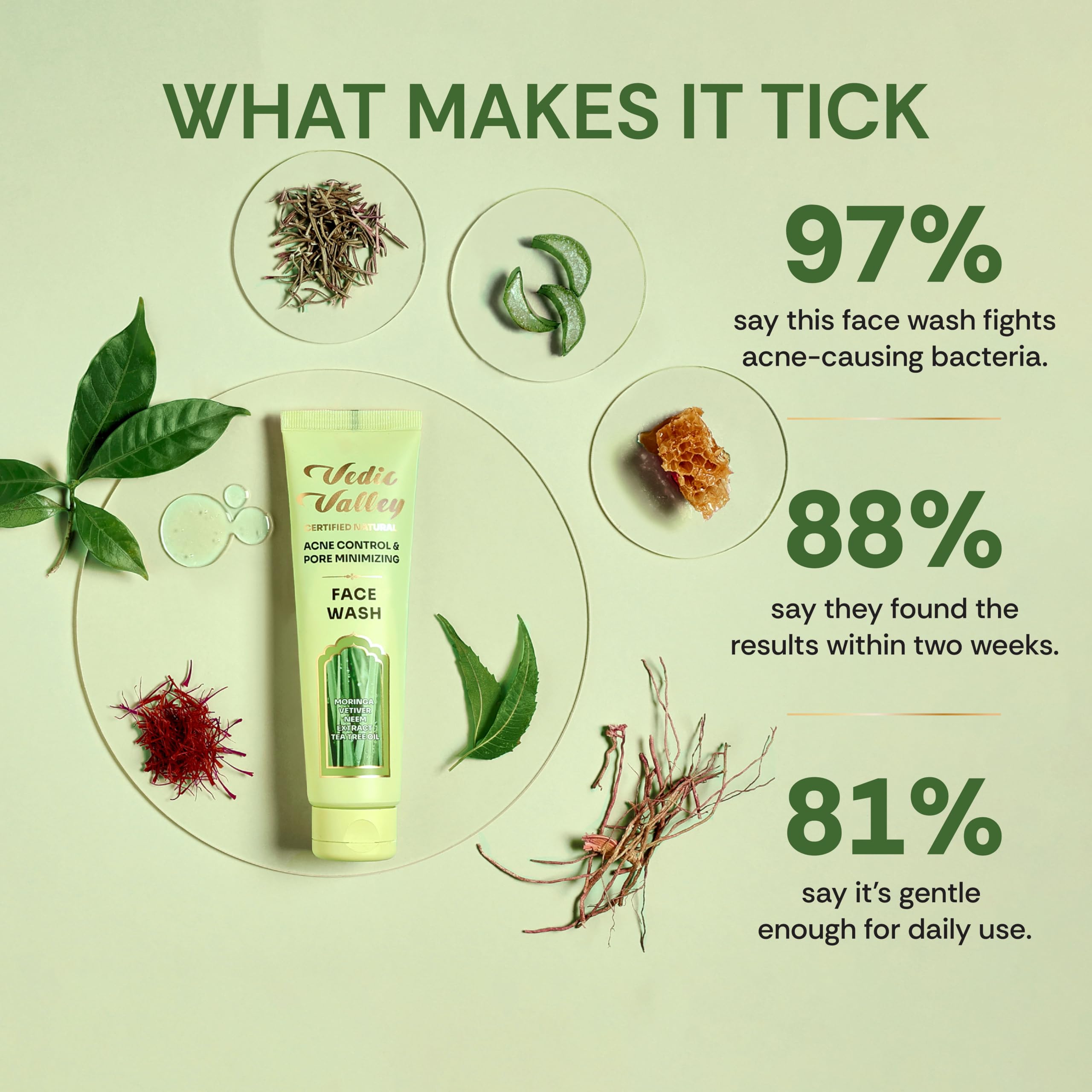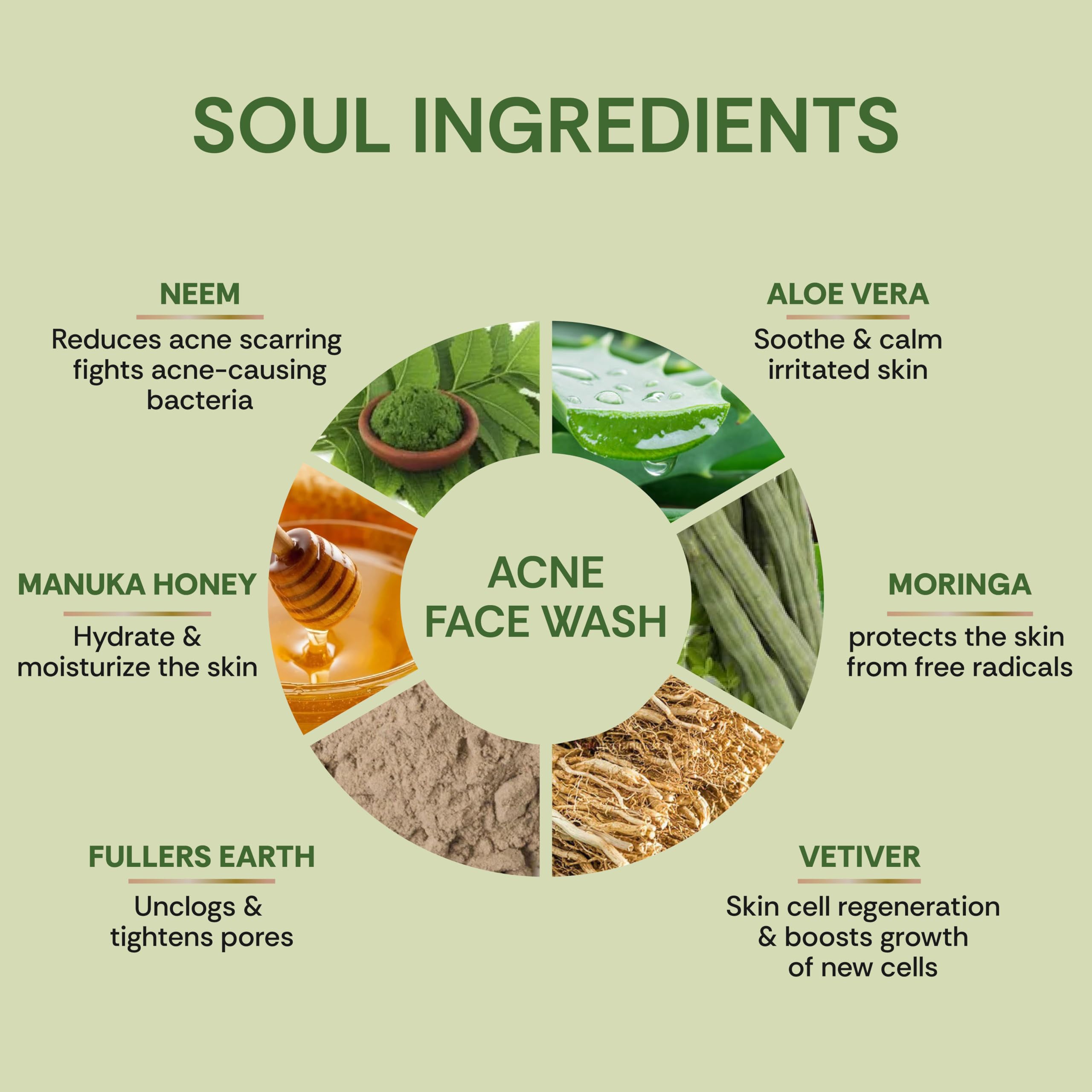 KEY INGREDIENTS - Moringa Extract Vetiver Extract Organic Cucumber Water Aloe Vera Juice Manuka Honey Fuller's Earth Nagkesar Extract Tea Tree Oil
