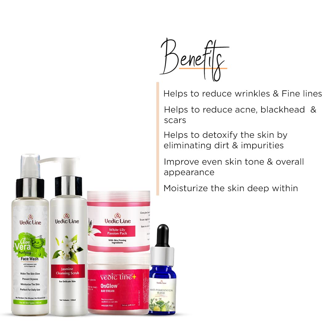 • Vedicline deep cleansing kit is just suitable for cleaning and exfoliating the top layer of dull skin. It nourishes firms tones and lightens the skin. itionally it revitalizes skin that is dry and lifeless.