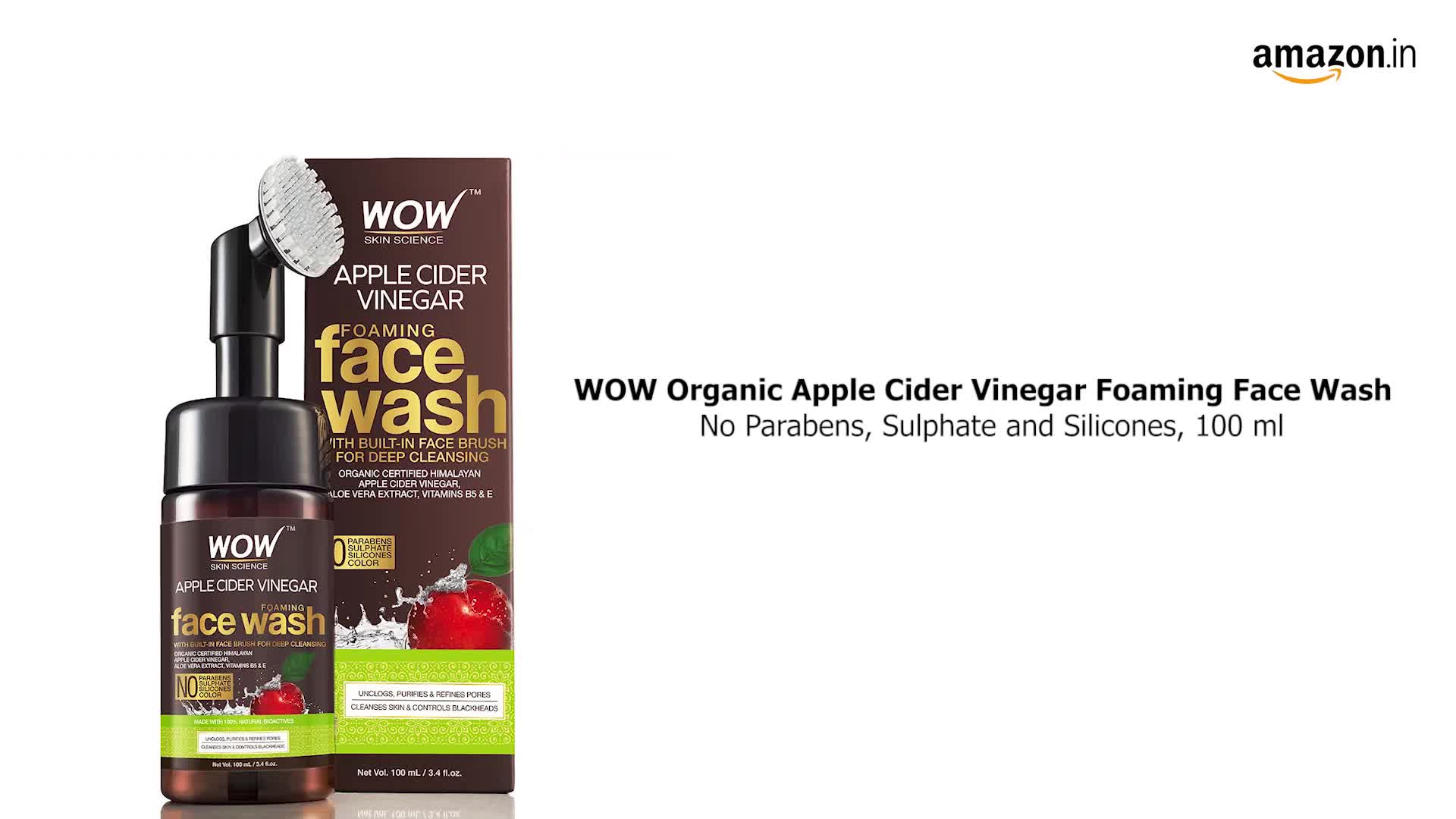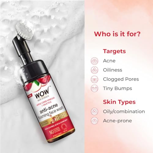 Design:Foaming FacewashWOW Skin Science Organic Apple Cider Vinegar Face Wash equipped with the foaming face brush is specially formulated to lock your pores with intense cleansing and nourishment. It helps in purifying pores and diffuse the mulish impurities leaves your skin clean clear and radiant with every wash. The packaging includes in-built face brush that is well designed with gentle silicone bristle to give your face deep cleansing on surfaced and within enlarged pores. Helps your skin to fight against acne and blackheads. Gentle cleansing and proactive anti-acne care for your skin with wow skin science apple cider vinegar foaming face wash! It is enriched with pure apple cider vinegar aloe vera extract and vitamins b5 and e for cleansing healing and hydrating care to get you clear soft and supple skin. When massaged on damp skin its rich foam dissolves and washes away the dead skin cells dirt and pollutants from the surface of your skin and all the open pores. Apple cider vinegar contained helps balance the essential skin oils tighten the open pores and lighten blemishes. The aloe vera extract soothes inflammations and gives an intensive hydration to your skin. Vitamin b5 and e can enhance the elasticity of your skin and its ability to retain moisture. All in all your skin will feel so much clearer softer and brighter. Key Ingredients: Purified Water Sodium Cocoyl Isethionate Sodium Lauroyl Sarcosinate Disodium Cocoamphodiacetate Decyl Glucoside Cocamidopropyl Betaine Glycerin (Vegetable Derived) Sodium Lactate Sodium PCA Apple Cider Vinegar Aloe Vera Extract D Panthenol (Pro-Vitamin B5) Tocopheryl Acetate (Vitamin E) Allantoin Sodium Benzoate Potassium Sorbate Phenoxyethanol & Fragrance. HOW TO USE Splash some water on the face and neck. Pump out a little amount of the face wash apply all over your face and neck. Use the built-in brush in a circular motion on your face and neck to remove dirt. Move from the base of your neck to the jawline and then upwards to the cheeks nose and forehead. Massage for 2 minutes and then rinse thoroughly with plain water. Use the face wash at night to keep your skin clear of dirt and pollution. Follow with a moisturizer.