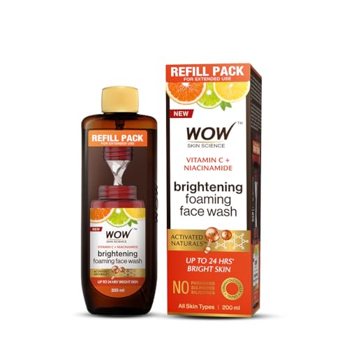Never worry about running out of your favourite WOW Skin Science brightening vitamin c foaming face wash with the refill pack. Extend your skin care routine and fill up your existing foaming face wash bottle from this pack. This lets you have great skin while being more responsible towards planet earth. You are able to reduce your carbon footprint because 30% of the material of this bottle is PCR (post consumer recycled) which helps us to make recycling easier and reduce the impact on landfill and garbage disposal system. Go on continue to keep your skin feeling refreshed and radiant with brightening vitamin c foaming face wash. It is a skin-reviving face wash that helps to refresh dull skin by gently removing layer of dead skin and keeping excess sebum in check. It is infused with active vitamin c orange and lemon essential oils liquorice and mulberry extracts that help to improve your skins texture and appearance. Vitamin c helps neutralize skin damaging fre radicals responsible for dullness age spots and wrinkles. Lemon and orange essential oils help even out complexion and restore skins radiance. Liquorice and mulberry extracts are proven melanin blockers that keep excess melanin production in check which helps to diminish spots and reduce uneven patchy complexion. Hyaluronic acid in the face wash is a natural moisturizer helps to keep the skin soft supple and hydrated as it supports skins collagen structure. It helps to give your tired dull complexion a radiance boost. Use the face wash twice a day to keep your skin clear of dirt and pollution. Its tangy citrusy fragrance revives your senses.