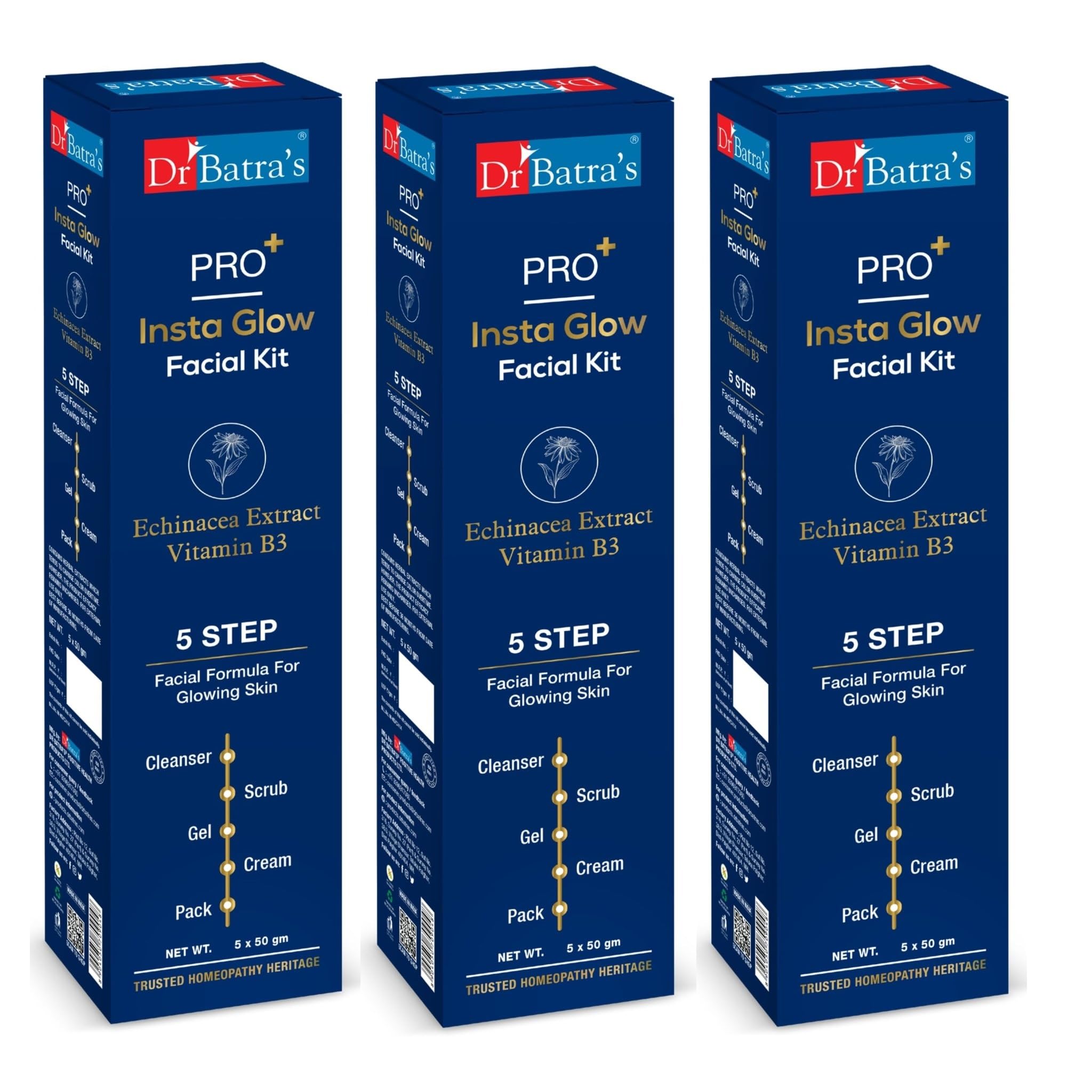 Dr Batra's PRO+ Insta Glow Facial Kit Enriched with Echinacea extracts & B3 Reduces Blemishes Face Wash for Clean Skin Protection from Sun Damage Moisturized Skin (250 gm Pack of 3)