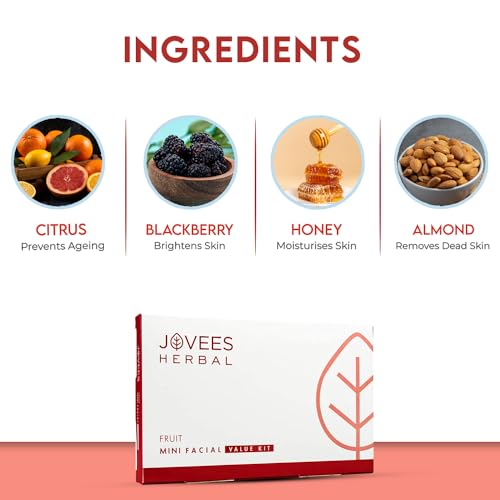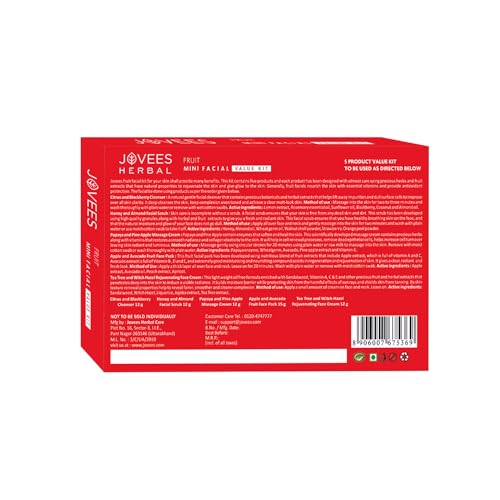 Jovees fruit facial kit for your skin shall provide many benefits. This kit contains five products and each product has been designed with utmost care using precious herbs and fruit extracts that have natural properties to the skin and give glow to the skin. Generally fruit facinourish the skin with essential vitamins and provide antioxidant protection. The facial be done using products as per the order given below. Citrus and blackberry cleanser a natural gentle facial cleanser that contains precious botanicand herbal extracts that helps lift away impurities and dull surface cells to improve over all skin clarity. It deep cleanses the skin keep complexion even toned and achieve a clear matt look skin Honey and almond facial scrub skin care is incomplete without a scrub. A facial scrub ensures that your skin is free from any dead skin and dirt. This scrub has been developed using high quality granules along with herbal and fruit extracts to give you a fresh and radiant skin. This facial scrub ensures that you have healthy breathing skin on the face and that the natural moisture and glow of your face does not go dull Paya and e apple massage cream papaya and e apple contain enzymes that soften and heal the skin. This scientifically developed massage cream contains precious herbs along with vitamins that restores a smooth radiance and collagen elasticity to the skin. It will help in cell renewal processes remove dead epithelial cells helps increase cell turn over leaving skin radiant and luminous Apple and avocado fruit face pack this fruit facial pack has been developed using nutritious blend of fruit extracts that include apple extract which is full of vitamin a and c avocado extract is full of vitamin b d and and extremely good moisturising and nourishing compound assists in regeneration and rejuvenation of skin. It gives a clear radiant and fresh look Tea tree and witch hazel rejuvenating face cream this light oil free formula enriched with sandalwood vitamin a c and e and other precious fruit and herbal extracts that penetrates deep into the skin to induce a visible radiance. It builds moisture barrier while protecting skin from the harmful effects of sun rays and shields skin from tanning. Its skin texture renewal properties help to reveal fairer smoother and clearer complexion.