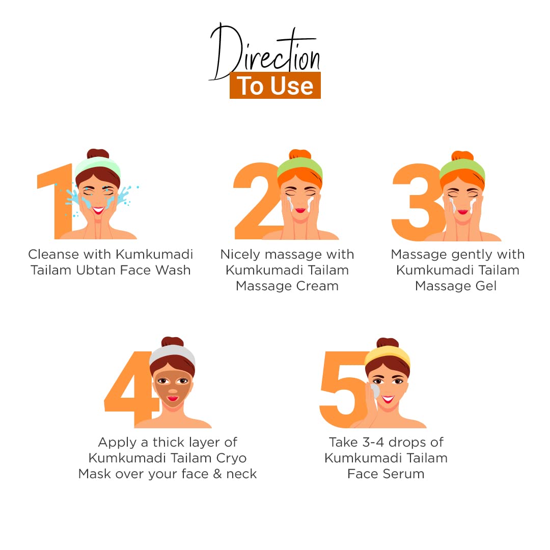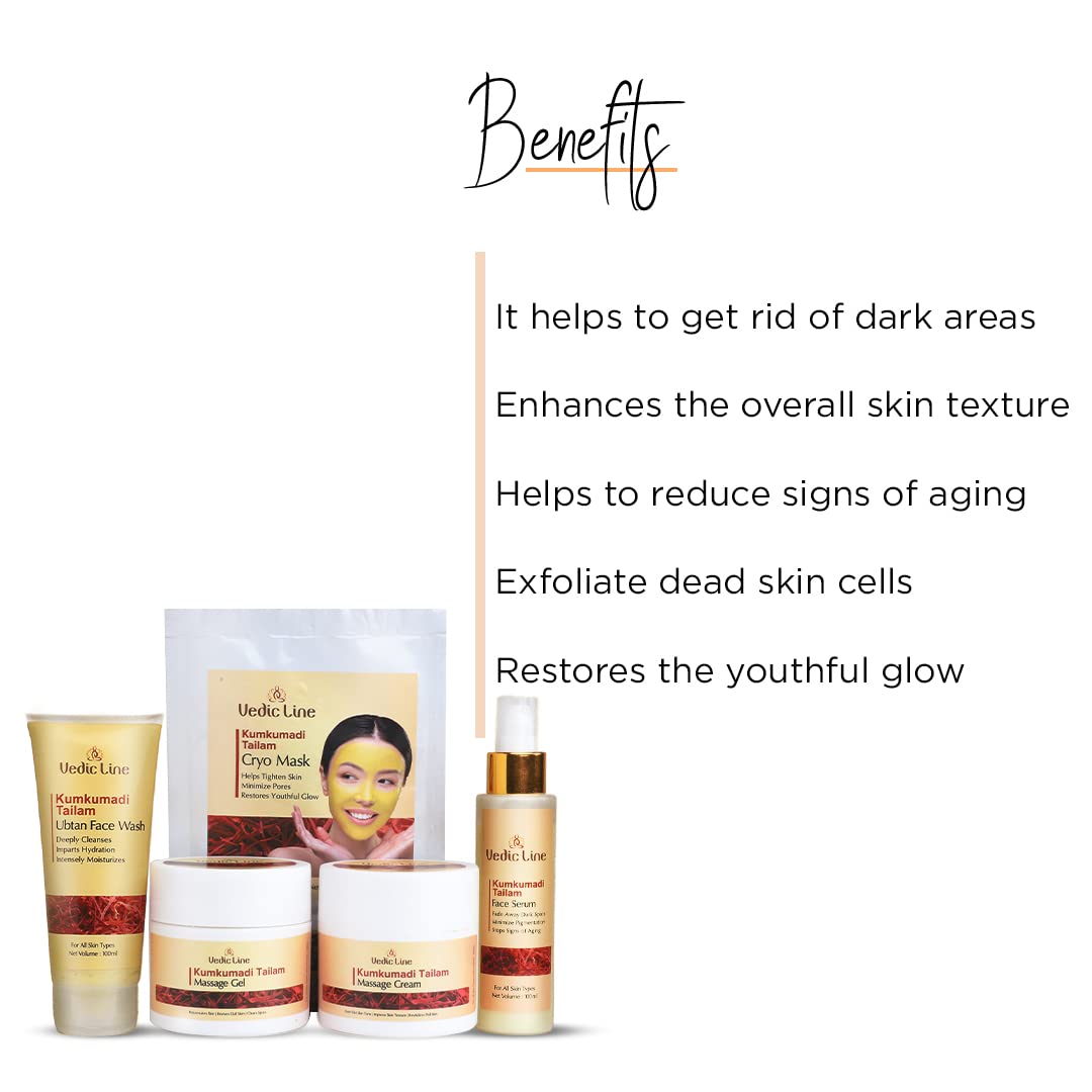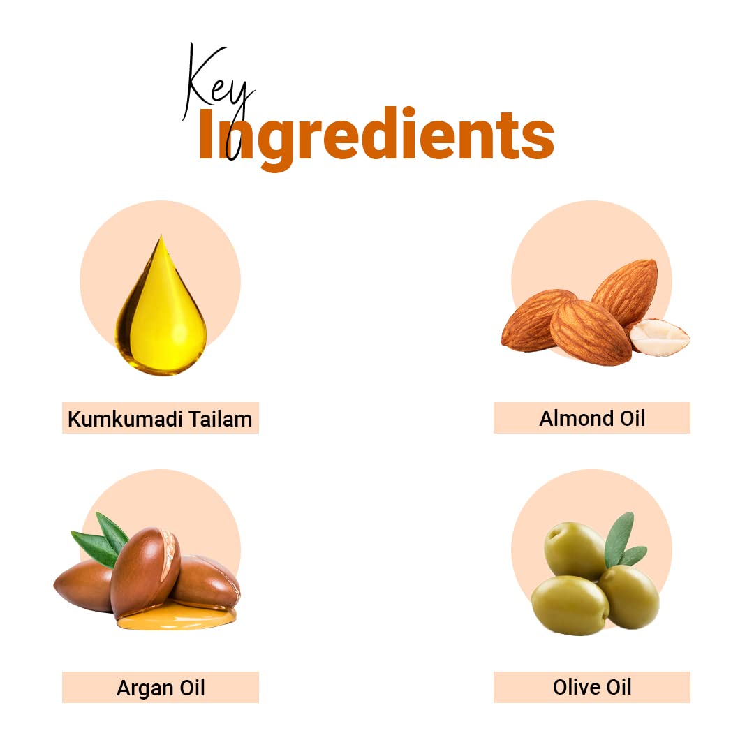 Enriched with Kumkumadi Tailam goodness which increases skin suppleness Almond oil slows the aging process. Olive Oil: hydrates and protects delicate skin Argan oil: helps in reducing excessive sebum.