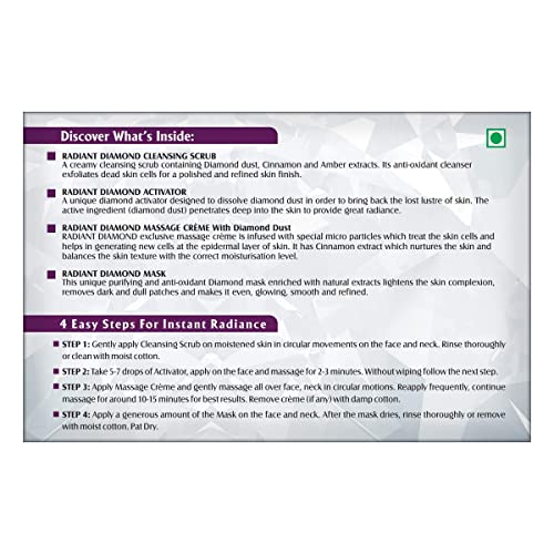 Lotus Herbals Radiant Diamond Deep-Cell Activation System Cellular Radiance Facial Kit is the combination of organic and natural items which rejuvenates the skin with cellular regeneration with deep cell activation system. It consists of radiant diamond exfoliating cleanser that consists of diamond dust and natural extracts. Another item present in the kit is radiant diamond activator which penetrate in the skin with diamond colloidal and promotes collagen production and fights with free radical damage. It also consists of Radiant diamond Massage Cream With diamond dust that helps wrinkles to get vanished and maintains skin firmness and muscle toning. The useful radiant diamond mask that rinses the dirt from the face and give you a glowing skin. This kit is clinically verified by dermatologists for their mildness on skin. Rejuvenate and glow your skin with Lotus Herbals Radiant Diamond Deep-Cell Activation System Cellular Radiance Facial Kit.
