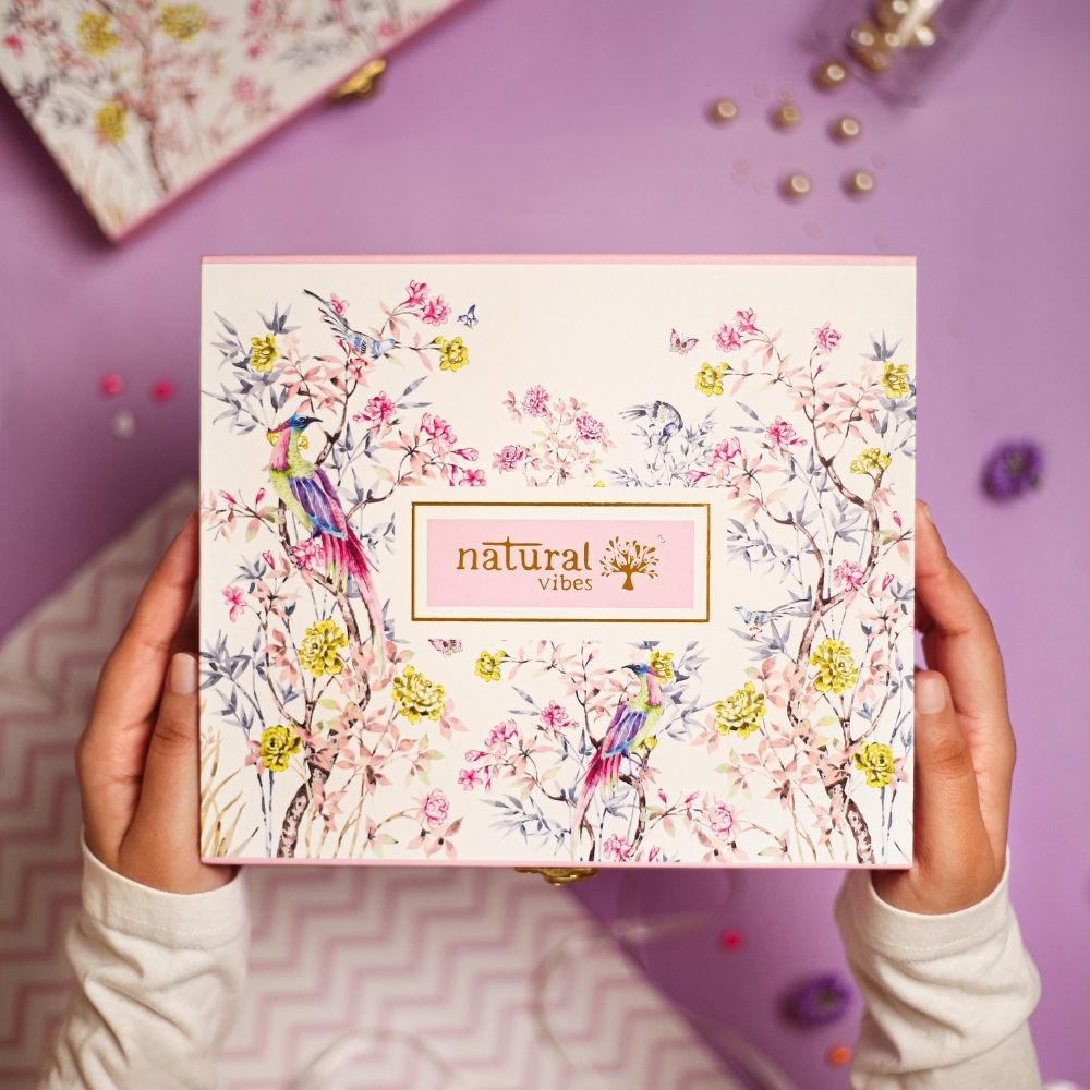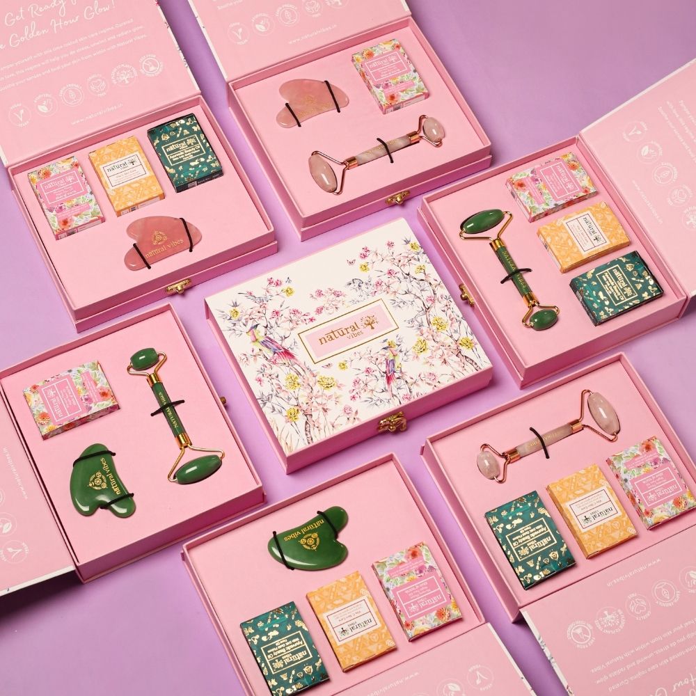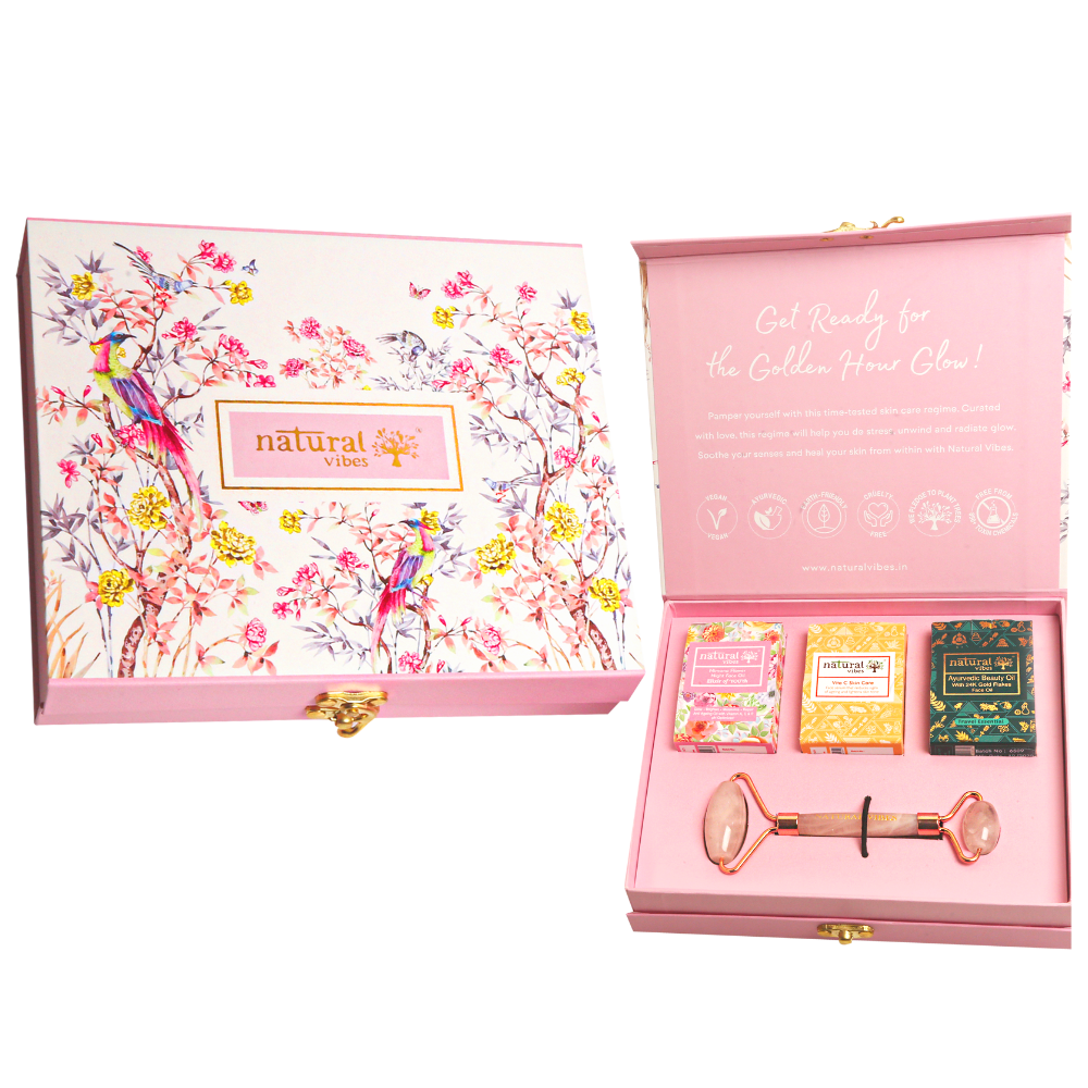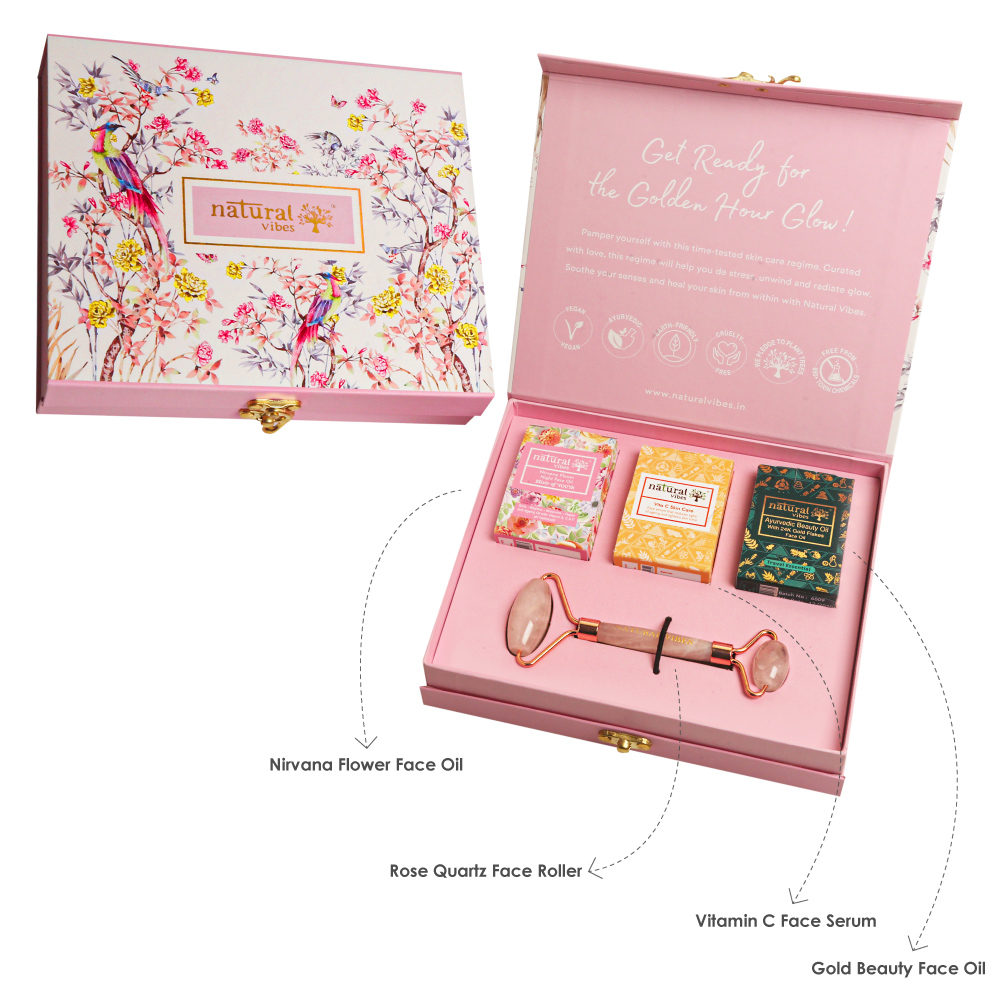 Natural Vibes Glow Getter Gift Set with Rose Quartz Face Roller, Vitamin C Serum, Nirvana Flower Oil and Gold Beauty Elixir Oil