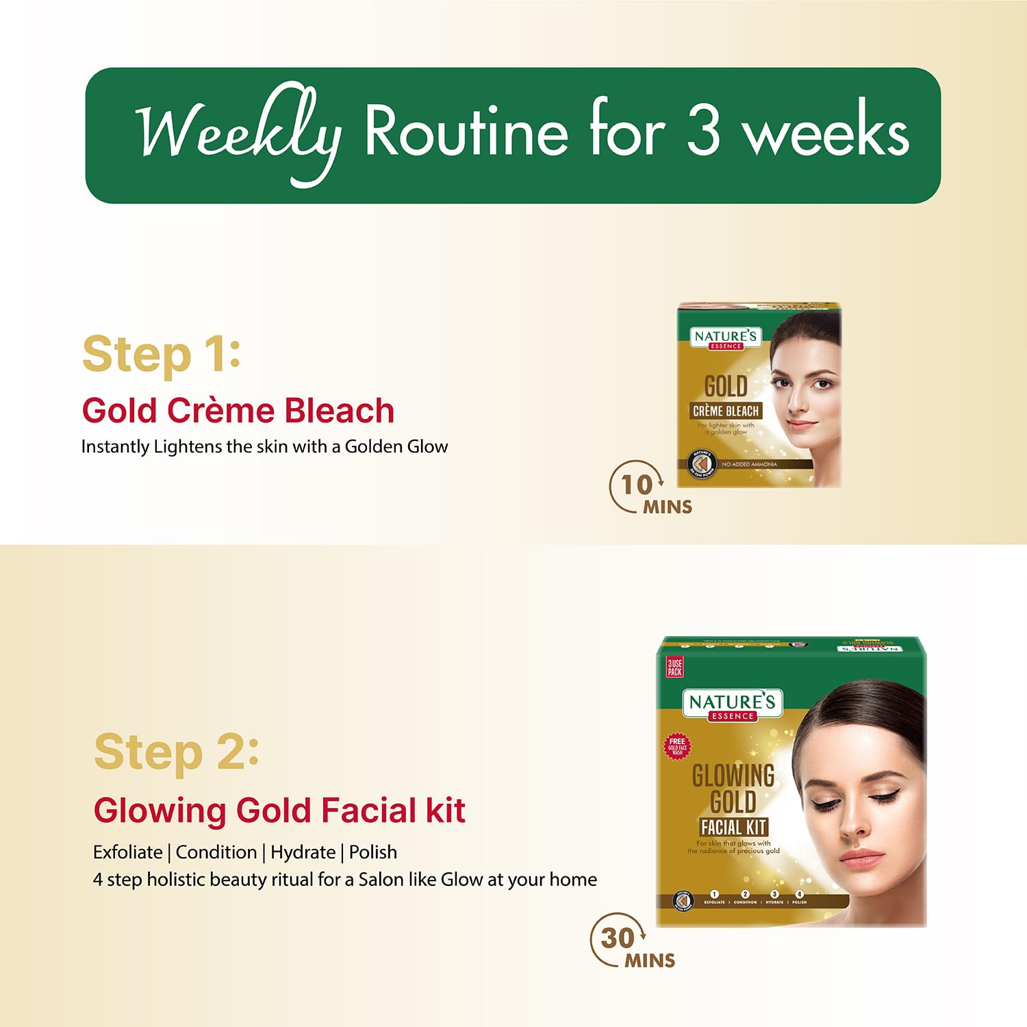 Your 3 weeks Beauty Regime for a Shaadi wala glow. DAILY RITUAL 1. Gold gel Face Wash 50ml 2. Facialist Radiance boosting Serum with 24K Gold 30ml 3. Facialist Radiance boosting cream with 24K liquid Gold 45g 4. Jade Roller Use Daily AM PM WEEKLY RITUAL 1. Gold Crème Bleach 21g 3 Use pack 2. Glowing Gold Facial kit 60g - 3 Use pack KIT CONTENTS ⢠Gold Crème Bleach 21gm Instantly Lightens the skin with a Golden Glow ⢠Glowing Gold Facial kit 60gm Exfoliate | Condition | Hydrate | Polish 4 step holistic beauty ritual for a Salon like Glow at your home ⢠Gold Face wash 50ml Deep cleanses the pores without dehydrating the skin ⢠Facialist Radiance boosting Serum with 24K Gold 30ml Formulated with 24K Gold + potent active ingredients that works deep within the skin to prolong the effects of your facial ⢠Facialist Radiance boosting cream with 24K liquid Gold 45g Repairs regenerates and nourishes the skin to help maintain the Facial Glow everyday ⢠Jade Roller Enhance blood circulation reduce puffiness and tighten the skin. Hydrate your face with Facialist 24K Gold Serum and just Roll it out! Massage on your Cheeks & jaw Forehead Under-eye area & Crow's feet. Use everyday