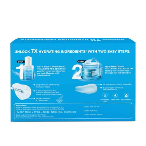 This Neutrogena Super Hydration Duo has Hydro Boost Hyaluronic Acid Serum 30 ml and Hydro Boost Hyaluronic Acid Water Gel 50 g. Both these products when used together provide 7X Hydrating Ingredients (compared to old formula of water gel alone)