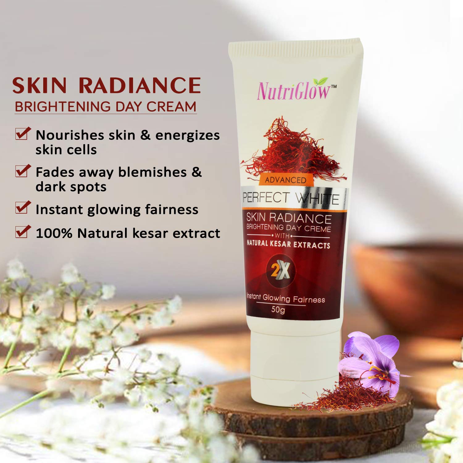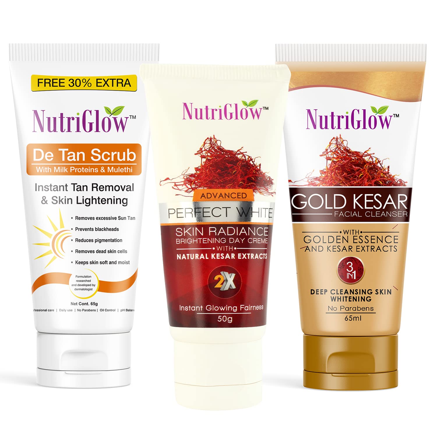 De-tan scrub is blended with milk proteins & mulethi to dissolve dead surface cells unclog pore openings and smooth the way for clear skin to surface. Gentle refining action uncovers skin's natural brightness for a younger-looking complexion. This scrub removes dead cells thus keeg your skin clear and refreshed. Its natural composition has a polishing effect and makes your skin soft and radiant by ing to its shine. Day Cream: Nutriglow Advance Perfect White Skin Radiance Brightening Day Creme with Natural Kesar Extracts 2x Instant Glowing Fairness.