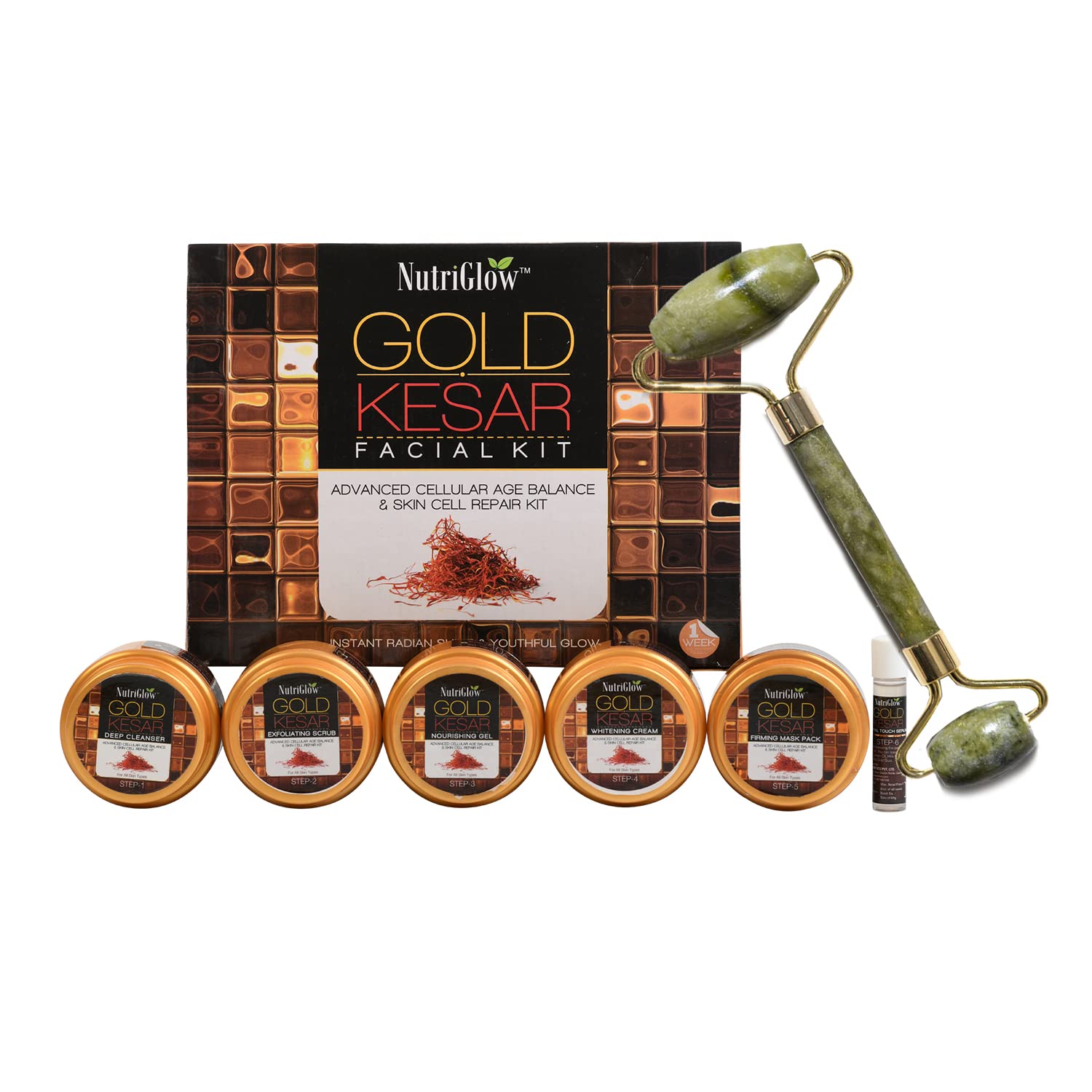 NutriGlow Gold Kesar Facial Kit | 6-Pieces Skin Care 260gm with Jade Roller