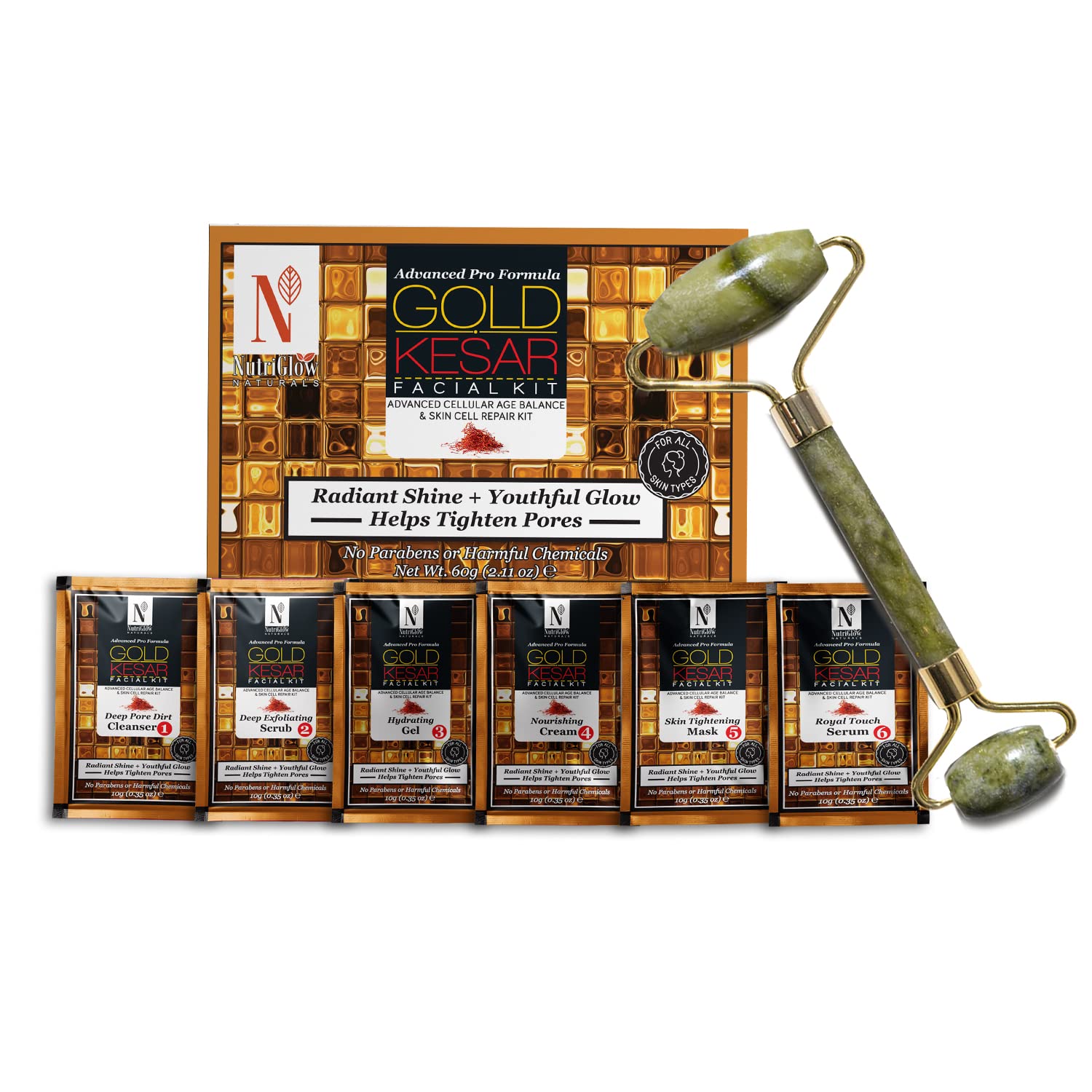 NutriGlow NATURAL'S Advanced Pro Formula Gold Kesar Facial Kit for Glowing Skin Cleanup Kit for Radiant Shine 60gm with Jade Roller