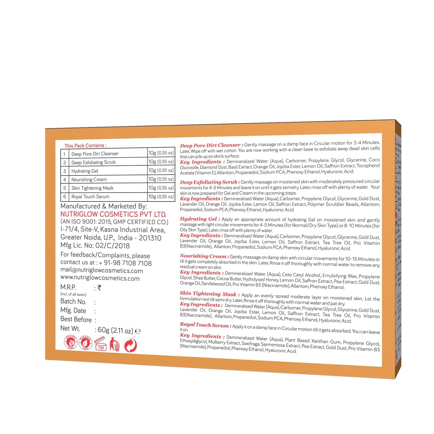 • The inclusion of Gold Kesar Deep Cleanser & Exfoliation Scrub in our facial kit gently eradicates grime from your face which improves skin radiance & makes you look younger & beautiful to complement your inner grace.