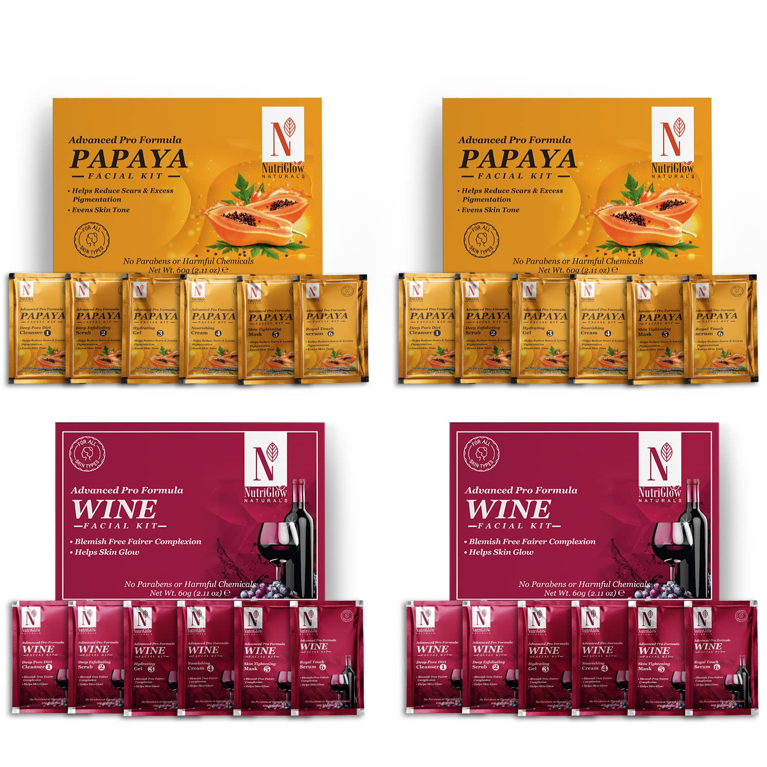 NutriGlow NATURAL'S Advanced Pro Formula Papaya Facial Kit & Wine Facial Kit For Hydrated Skin & Fairer Complexion Even Tone Blemish Free & Glowing Skin 10gmx6 Each Pack of 4