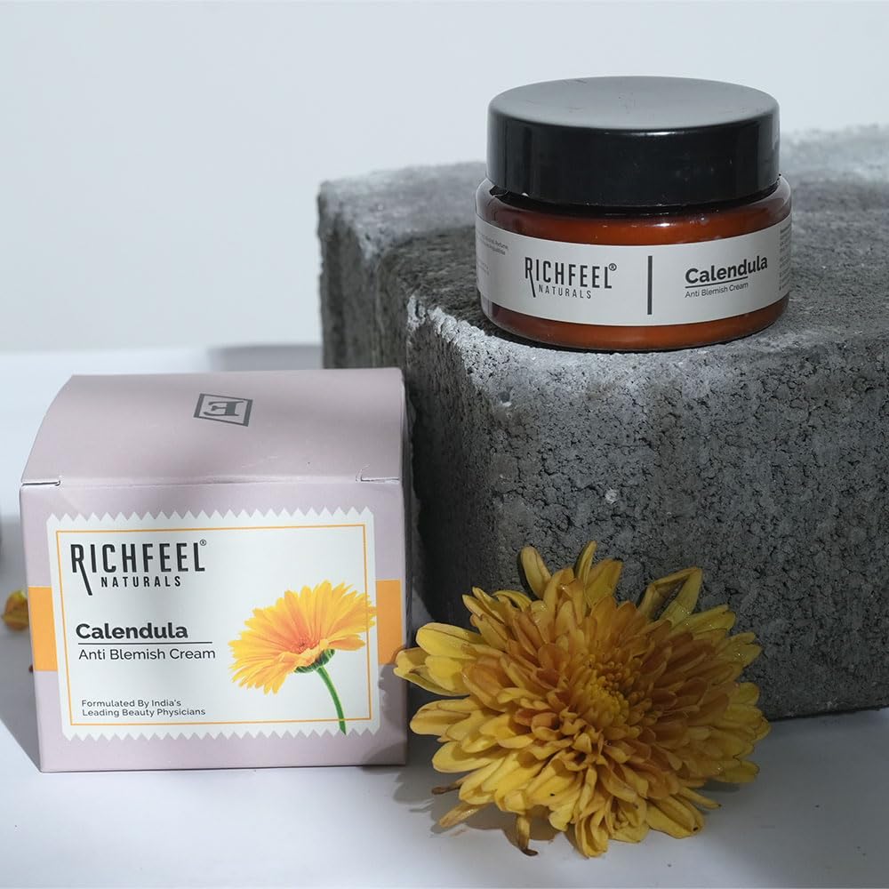Calendula Anti Blemish Cream: Complete your acne-busting routine with our Calendula Anti Blemish Cream. This lightweight yet nourishing cream targets blemishes and dark spots promoting a more even skin tone. Calendula extract works in synergy with other s
