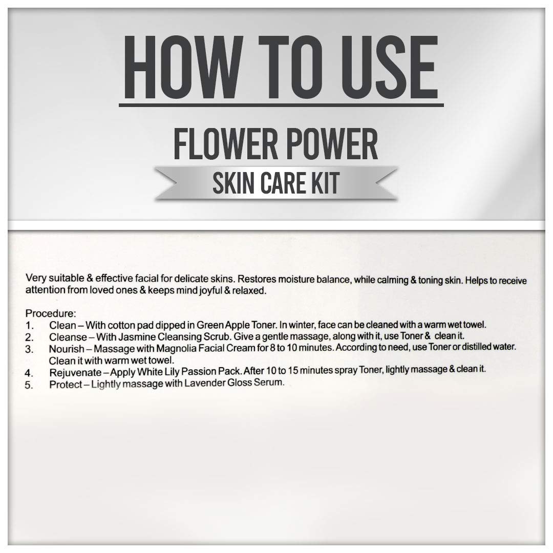 Vedicline Flower cosmetics have carefully chosen floral extracts popular in different countries for bringing joy to . These are o enriched with oils vitamins miner& anti. Products in Kit (4): Jasmine Cleansing Scrub 100 ml Magnolia Massage Cream 100ml White Lily Passion Pack 100ml Lavender GSerum 100 ml INGREDIENTS:1. Magnolia strengthens tissues. 2. White Lily Calms & hydrates. 3. Jasmine sooths promotes fairness. 4. Lavender suits all types of skin soft & gentle. Procedure for the Facial Step 1 : Clean â With cotton pad dipped in Green Apple Toner. In winter warm wet towel can be used. Step 2 : Cleanse & Exfoliate â With Jasmine Cleansing Scrub gently massage for 2/3 minutes along with it use Toner & clean it. Spray Toner & blot it with tissue. Step 3 : Nourish â Massage with Magnolia Facial Cream for 10/12 minutes along with it use Toner. Clean excess from skin. Step 4 : â Apply White Lily Passion Pack when semi dry spray Toner lightly massage & clean it. Again spray Toner & blot it. Step 5 : Protect â Lightly apply Lavender GSerum if needed SPF 15.