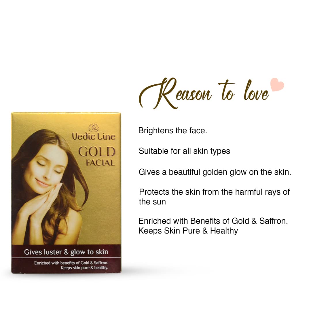 • With Gold dust particles in the Vedicline Gold Facial Kit improves skin texture and gives a shine and golden glow which leave your skin soomther & radiant complexions.