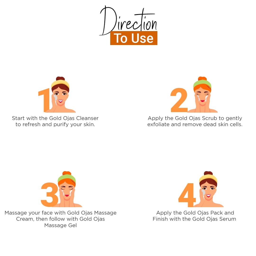 • Procedure for the facial - step1:- clean with green apple toner step2:- cleanse with goldojas cleanser step3:- exfoliate with goldojas scrub step4:- nourish with massage cream step5:- with goldojas pack step6:- protect and glow with goldojas moisture seru