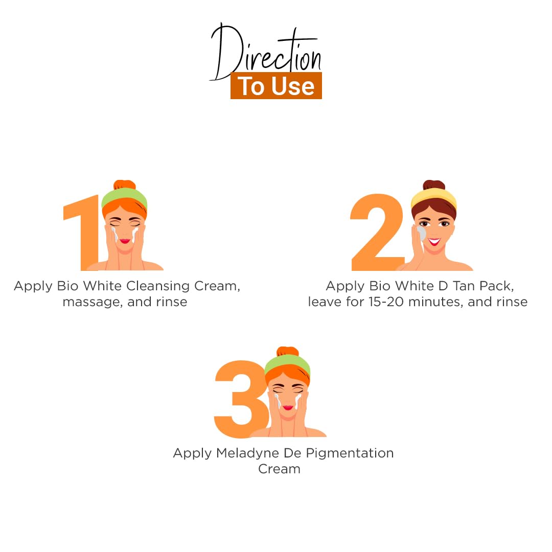 Unlock the magic of flawless skin with our De Tan combo featuring Bio White Cleansing Cream Bio White D Tan Pack and Meladyne De Pigmentation Cream. Begin your journey to luminosity with the Bio White Cleansing Cream gently lifting impurities while brightening your complexion. Then indulge in the Bio White D Tan Pack specially formulated to banish tan lines and reveal a radiant glow. Finish with our Meladyne De Pigmentation Cream designed to minimize pigmentation and uneven skin tone leaving you with a smooth even complexion. Embrace the magic of radiant skin with this transformative trio."