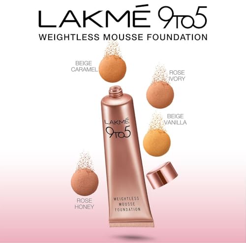 Lakme 9 to 5 weightless mousse foundation is your answer to a workings women's barrier to using foundation. It is a lightweight foundation meant for everyday use. It is so lightweight that you won't even feel you are wearing foundation. It not only blends in effortlessly but gives a matte finish that lasts through the day. It is available in 2 shades in mini pack and is extremely convenient to carry. Foundation with new formula that feels soft and incredibly weightless and is perfect for everyday office use. It blends effortlessly onto skin to conceal imperfections with a matte finish that stays through the day. With complete coverage it's a foundation so weightless you may forget you are wearing any foundation matte finish in a weightless mousse texture pocket sized tube that is easy to carry around complete coverage lightweight and long wear available in 2 office-wear shades â rose ivory beige vanilla. It is suitable for all skin types and is dermatologically tested. How to apply: just take a small amount of product with the index finger and start applying it to the skin with your fingertips. Usually you can just apply the mousse in four places: the forehead nose chin and cheekbones. Blend into your skin starting from the centre of the skin outwards taking care to cover your face including your neck.