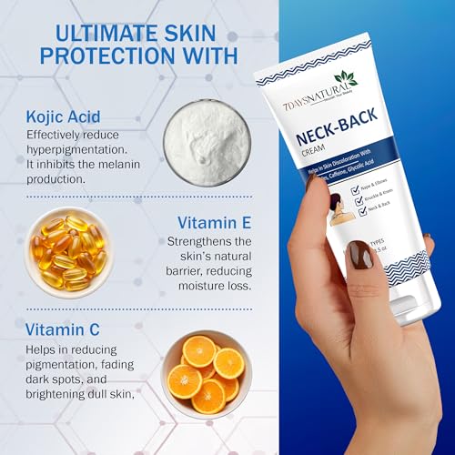 • Smooth and texture-free skin: Sweat and impurities often cause dead skin to stick together resulting in rough skin especially in areas like Neck elbows knees and inner thighs that face constant rubbing . 7 Days Neck Whitening Cream contains Kojic Acid Vit
