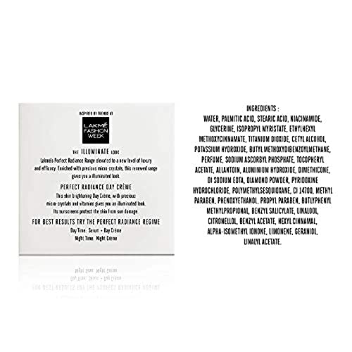 Inspired by the illuminate trend Lakme's perfect radiance range is now elevated to a new level of luxury and efficacy. The high-resolution clarity of a crystal is now captured in the new Lakme absolute perfect radiance range. If you wish for skin that has a flawless and illuminating glow then this Lakme absolute perfect radiance skin brightening day creme is formulated just for you. This skin brightening day creme with precious micro-crystals and skin brightening vitamins gives you a fair illuminated look. Moisture rich yet so ultra light this creme melts into your skin with a silky feel. This formulation gently polishes your skin to reveal that illuminated look. This day creme replenishes and moisturizes your skin giving it an instant fairer glow. Its advanced skin brightening formula is infused with vitamins to give you a radiant flawless skin. Its smooth rich texture suits all skin types and is perfect to add to your cosmetic kit. Its sunscreens with spf 30 protect your skin from sun damage. Along with luminous glowing skin the day cream gives you an even skin surface. It prevents dark spots blemishes and breakouts giving you the perfect radiant look. Look younger and glow every day with the Lakme perfect radiance fairness day creme- buy it now.