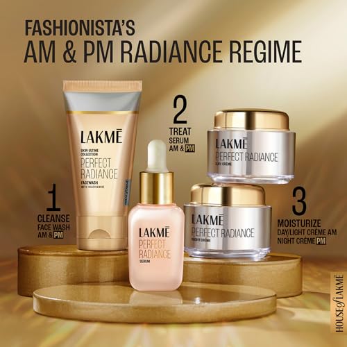 Product Description Inspired by the illuminate trend Lakme 's Perfect Radiance range is now elevated to a new level of luxury and efficacy. The high-resolution clarity of a crystal is now captured in the New Lakme Absolute Perfect Radiance range. If you wish for skin that has a flawless and illuminating glow then this Lakme Absolute Perfect Radiance Skin Brightening Day Creme is formulated just for you. This Skin Brightening Day creme with precious micro-crystals and skin Brightening vitamins gives you a fair illuminated look. Moisture rich yet so ultra light this creme melts into your skin with a silky feel. This formulation gently polishes your skin to reveal that illuminated look. This Day Creme replenishes and moisturizes your skin giving it an instant fairer glow. Its advanced skin Brightening formula is infused with vitamins to give you a radiant flawless skin. Its smooth rich texture suits all skin types and is perfect to add to your cosmetic kit. Its sunscreens with SPF 30 protect your skin from sun damage. Along with luminous glowing skin the day cream gives you an even skin surface. It prevents dark spots blemishes and breakouts giving you the perfect radiant look. Look younger and glow every day with the Lakme Perfect Radiance Fairness Day Creme- buy it now! Step 1: Lightly scoop out the creme on to your palm. Step 2: Dot your forehead cheeks nose and chin. Step 3: Gently massage the creme with your fingers in an upward and outward direction in a spiral motion. Step 4: Make sure to cover every area of your face. From the Manufacturer Lakme Perfect Radiance Intense Whitening Day Creme addresses the need of having a smooth and radiant skin for men and women. It does this by treating most common skin problems like dark spots acne blemishes excessive tanning oiliness and dullness. This cream is ideal for occasional as well as daily use. Consistent use of this cream will rid you of most skin problems leaving clean fair soft and smooth skin behind.This cream penetrates into deep skin layers treating your skin at the roots. It controls any excess formation of melanin that causes skin darkness. It also contains skin lightening vitamins to enrich your skin and regular use will give you fairer skin. It is good for use on oily as well as dry skin and it provides a moisturizing effect on your skin. The cream also leaves a floral fragrance on your skin. The titanium dioxide listed as one of its ingredients works as a sunscreen as well.The Lakme Perfect Radiance Intense Whitening Day Creme should not have contact with your eyes and in case this happens your eyes need to be washed properly with cold water. This cream is only for external use. This product is a great option for an instant whitening effect and long-term fading of any spots on your skin.Product Features The cream comes in a 50g container. It is safe for all skin types and suitable for men and women. It has titanium dioxide that works as sunscreen. It provides an instant whitening effect. It is safe for daily use.