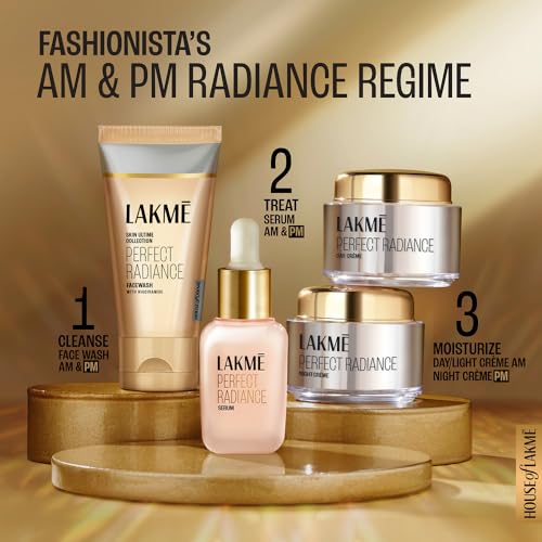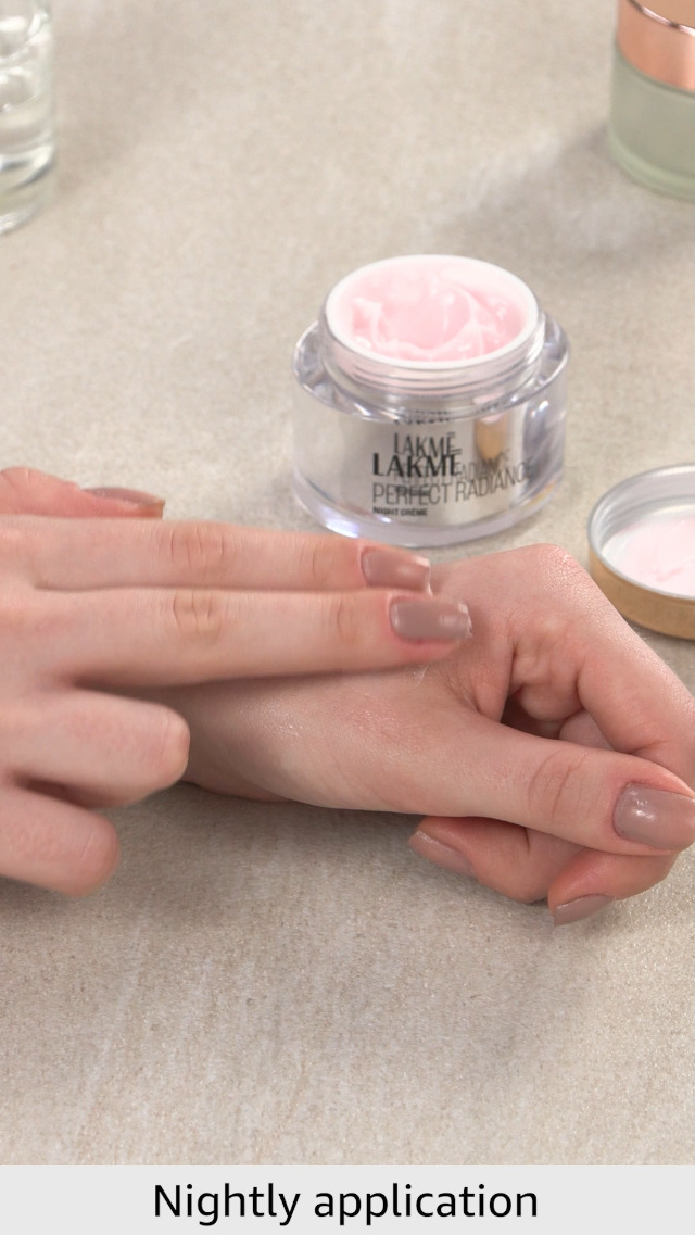Inspired by the illuminate trend Lakme 's Perfect Radiance range is now elevated to a new level of luxury and efficacy. The high-resolution clarity of a crystal is now captured in the New Lakme Absolute Perfect Radiance range. This Skin Lightening Night Creme with precious micro-crystals and skin lightening vitamins intensely nourishes and lightens your skin through the night so that you can wake up to a fair illuminated look and a smooth feel. This cream contains skin lightening vitamins that reveal stunning results on regular application to your face and neck after cleansing just before you go to bed. Lakme 's Absolute Perfect Skin Lightening Night Creme will nourish and repair your skin to a flawless perfection. Observe and love difference in your skin after using this cream for a few days as the night creme gently works on your skin overnight and repairs it. This night time replenishment combined with the goodness of simple regimes of other Lakme Absolute Skin Lightening products works its magic to improve your skin tone and texture. With simple regimes involving Lakme Absolute Perfect Radiance Light Creme and Serum this range not only nourishes and protects your skin during the day by also repairs and replenishes it overnight to give you a 24 hour protection. Application : Step 1: Lightly scoop out the creme on to your palm. Step 2: Dot your forehead cheeks nose and chin. Step 3: Gently massage the creme with your fingers in an upward and outward direction in a spiral motion. Step 4: Make sure to cover every area of your face.