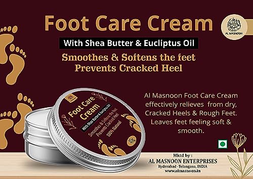 AL MASNOON Foot Care Cream with Shea Butter & Eucalyptus Oil is specially formulated to provide nourishment and relief for tired and dry feet. Shea Butter known for its rich moisturizing properties deeply hydrates the skin while Eucalyptus Oil offers a refreshing and soothing sensation. Together they work to smooth and soften rough areas promoting healthier-looking feet.