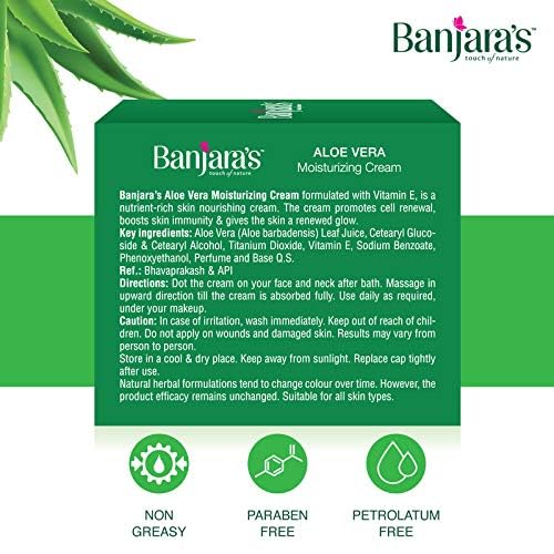 • Banjara's Aloe Vera Moisturizing cream Formulated with Vitamin E is a nutrient- rich skin nourishing cream. The cream promotes cell renewal boosts skin immunity & gives the skin a renewed glow.