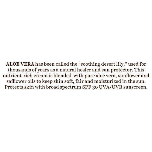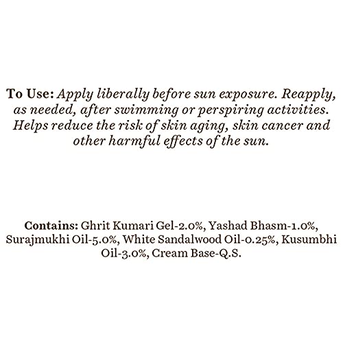 Description:Â This nutrient-rich cream is blended with pure aloe vera sunflower and safflower oils to keep skin soft fair and moisturized in the sun. Protects skin with broad spectrum SPF 30 UVA/UVB sunscreen. Ingredients:Ghritkumari (Aloevera barbadensis) Chandan (Santalum album) Surajmukhi (Helianthus annuus) Kusumbhi (Cartamus tinctorius) Yasad (Zincum) Cream base Q.S. How to Use:Apply liberally before sun exposure. Reapply as needed after swimming or perspiring activities.
