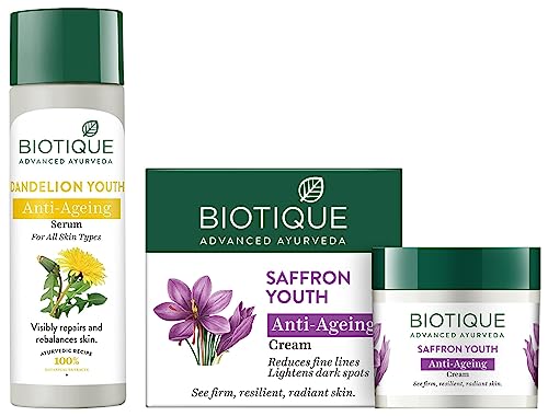 Biotique Bio Dandelion Visibly Ageless Serum, 190ml And Biotique Bio Saffron Dew Youthful Nourishing Day Cream For All Skin Types, 50G
