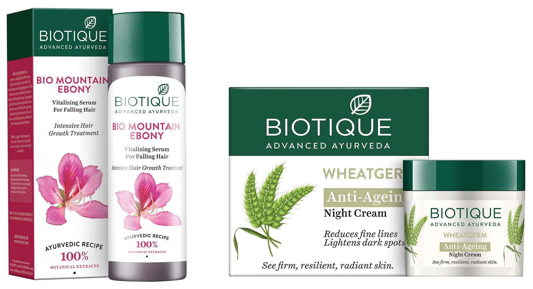 Biotique Bio Mountain Ebony Vitalizing Serum For Falling Hair Intensive Hair Growth Treatment 120MLStimulates hair from root to tip and leaves scalp feeling toned exhilarated free from dryness and irritation. It does not make hair greasy.Biotique Bio Wheat Germ FIRMING FACE and BODY NIGHT CREAM For Normal To Dry Skin 50GThis Biotique Firming cream comes with an organic blend of ayurvedic ingredients such as Pure Wheat Germ Extracts Sunflower and Almond oils Kulanjan Badam and carrot extracts. These components are high on Vitamins and Proteins that are very much essential to nourish the skin. This Wheat Germ cream hydrates your skin and provides long-lasting moisturization. The firming cream enhances new cell growth and reduces wrinkles making your skin smoother.
