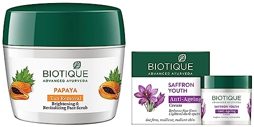 Biotique Papaya Tan Removal Brightening & Reviatalizing Face Scrub For All Skin Types 235gBiotique Bio Papaya Revitalizing Tan-Removal Scrub 235gBiotique Saffron Youth Anti-Ageing Cream Reduces fine lines Lightens dark Spots 50gBiotique has come up with yet another awe-inspiring product for women the Biotique Bio Saffron Dew Ageless Face and Body Cream. If you are looking for a body cream that can improve your skin texture and moisturise it properly opt for this Biotique product. This light-feeling moisturiser has been finely blended with almond and wild turmeric extracts pure saffron pistachio oils that help in sustaining the skinâs dewy fullness of youth. This face and body cream is best for treating wrinkles and dry lines. Regular use of this cream will help in reducing these skin issues. Besides treating wrinkles this body cream has the capability of revitalising the skin cells and retaining the youthfulness of skin. This Biotique anti-aging face and body cream is basically a natural source of vitamins and minerals that nourishes the skin finely. Ingredients: Rakt chandan (Pterocarpus santalinus) Madhu (Honey) Ashwagandha (Withania somnifera) Adu (Prunuspersica)) Cream base Q.S. Arjun (Terminalia arjuna). How to use? Wash your face with cold water before you apply the cream. Apply it with circular massage motions and continue doing so until it is absorbed. For better results use it twice a day. When it comes to skin nourishment Biotique products are the best. This body and face cream not only lightens the dark spots but also delivers an instant glow to your face. Go for this product if you really want to have moisturised and glowing skin. Opt for the 55gm Biotique Bio Saffron Dew Ageless Face and Body cream and see the glowing effect.