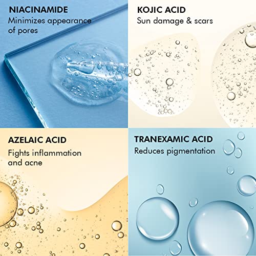 • Unique formula of Niacinamide in combination with Azelaic acid and Kojic acid helps improves the skin’s texture evens out the skin tone and tackles hyperpigmentation.