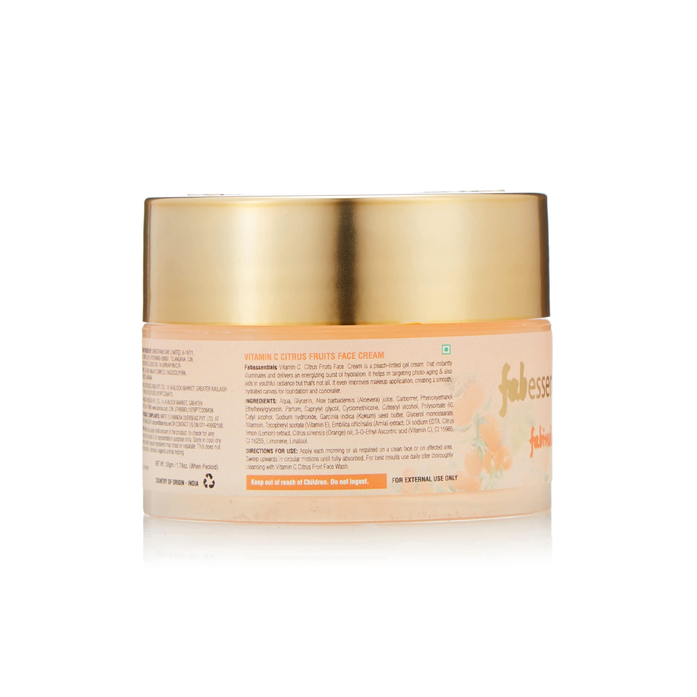 Fabessentials Vitamin C Citrus Fruits Face Cream is a gel cream that instantly illuminates and delivers an energizing burst of hydration. It helps in targeting photo-ageing & also aids in achieving youthful radiance but thatâs not all. It even improves makeup application creating a smooth hydrated canvas for foundation and concealer.