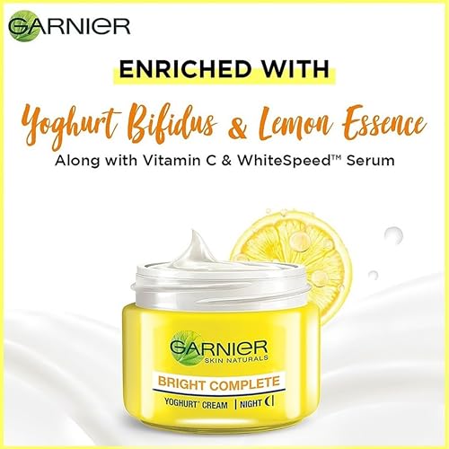 Nourish your skin while you are asleep with the Garnier Skin Naturals Bright Complete Vitamin C Yoghurt Night Cream. The lightweight cream for bright and glowing skin quickly gets absorbed into your skin without making it too sticky and helps with skin brightening. This Garnier Skin Naturals cream is enriched with the goodness of VITAMIN C LEMON ESSENCE YOGHURT BIFIDUS and WHITESPEED SERUM which helps reduce dark spots and brightens your skin. With the Vitamin C cream you can notice visible fading of your dark spots after the first night of application. The Vitamin C face cream also helps you exfoliate dead cells and keep tanning at bay. The night cream is dermatologically tested making it a safe and suitable night cream for bright skin in the morning. How to use: After cleansing your face and neck at night apply 3-4 drops of the Garnier Bright Complete Vitamin C Serum. Follow that with a small dollop of the Garnier Bright Complete Night Cream. Gently massage the cream all across your face in an upwards motion. For an added bonus you could also massage your face for 60 seconds to ensure the cream has completely sunk in. Avoid the delicate eye area while applying the night cream. For best results use with the Garnier Bright Complete Facewash and Garnier Bright Complete Serum Cream during the day.