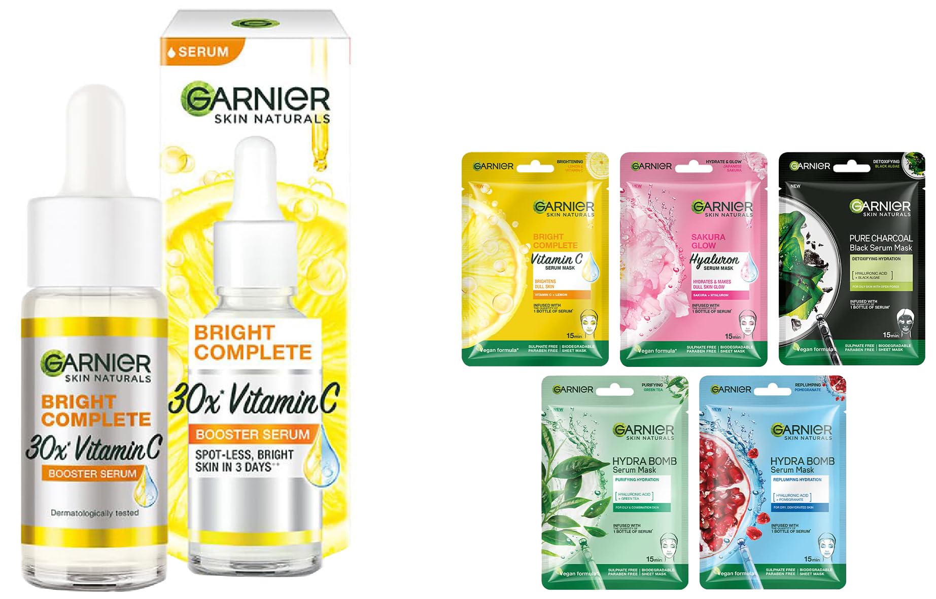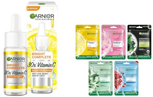 Garnier Skin Naturals Face Mask Set Hydrating Pore Reducing Brightening and Enhances Glow Hydra Bomb Serum Mask & Black Serum Mask 5 pcs 140gGarnier Sheet Masks give your skin a facial-like glow in just 15 mins and helps brighten it instantly. The sheet masks are a breakthrough technology that offers hydrating efficacy with natural ingredients. The sheet mask has been dermatologically tested. Suitable for all skin types including sensitive skinGarnier Skin Naturals Face Serum Brightening and Anti-Dark Spots Bright Complete Vitamin C Booster 15 mlBright Complete Vitamin C Booster Face Serum is Garnier's most concentrated brightening formula yet. Compared to our day cream this serum is enriched with 30 times the amount of Vitamin C! Together with the lemon extract this lightweight non-oily formula penetrates the skin to instantly increase its glow as well as reduce dark spots in 3 days* - all in a safe and natural way! (* According to clinical tests)